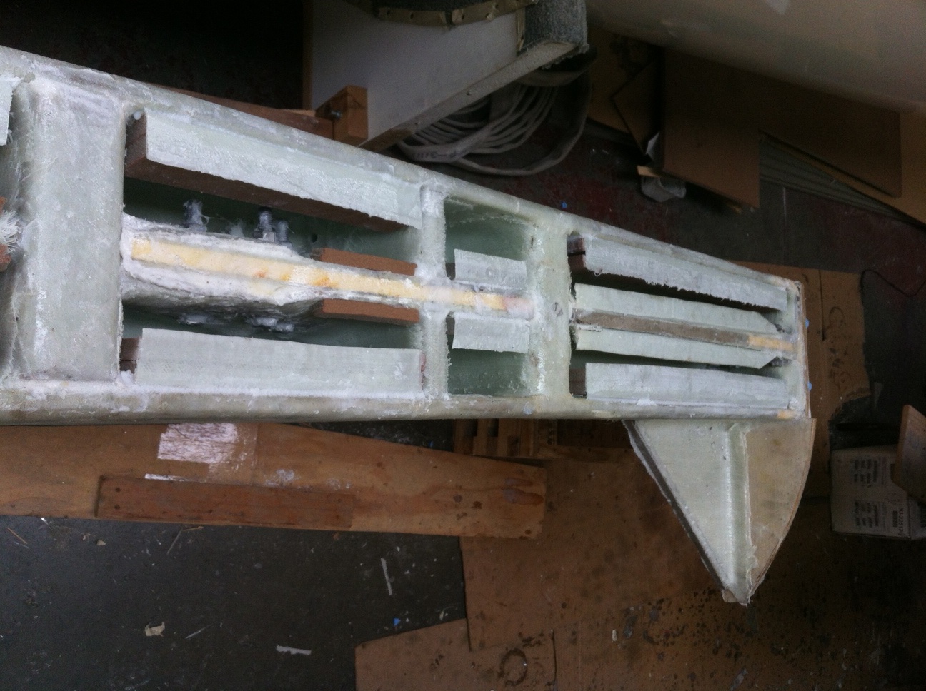 It’s been two months since a post because progress has been tedious with many little steps to finishing the internal webs / structures inside the beams. And severely limited building hours due to lots of business travel. In the photo the ‘wings’ just inboard of the sides, plus the brown foam along the center, are glueing attachment points for the beam top. When sealed up, the glue joints complete the box structure for final rigidity. The tops will never be able to come off without major surgery.