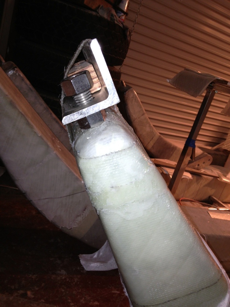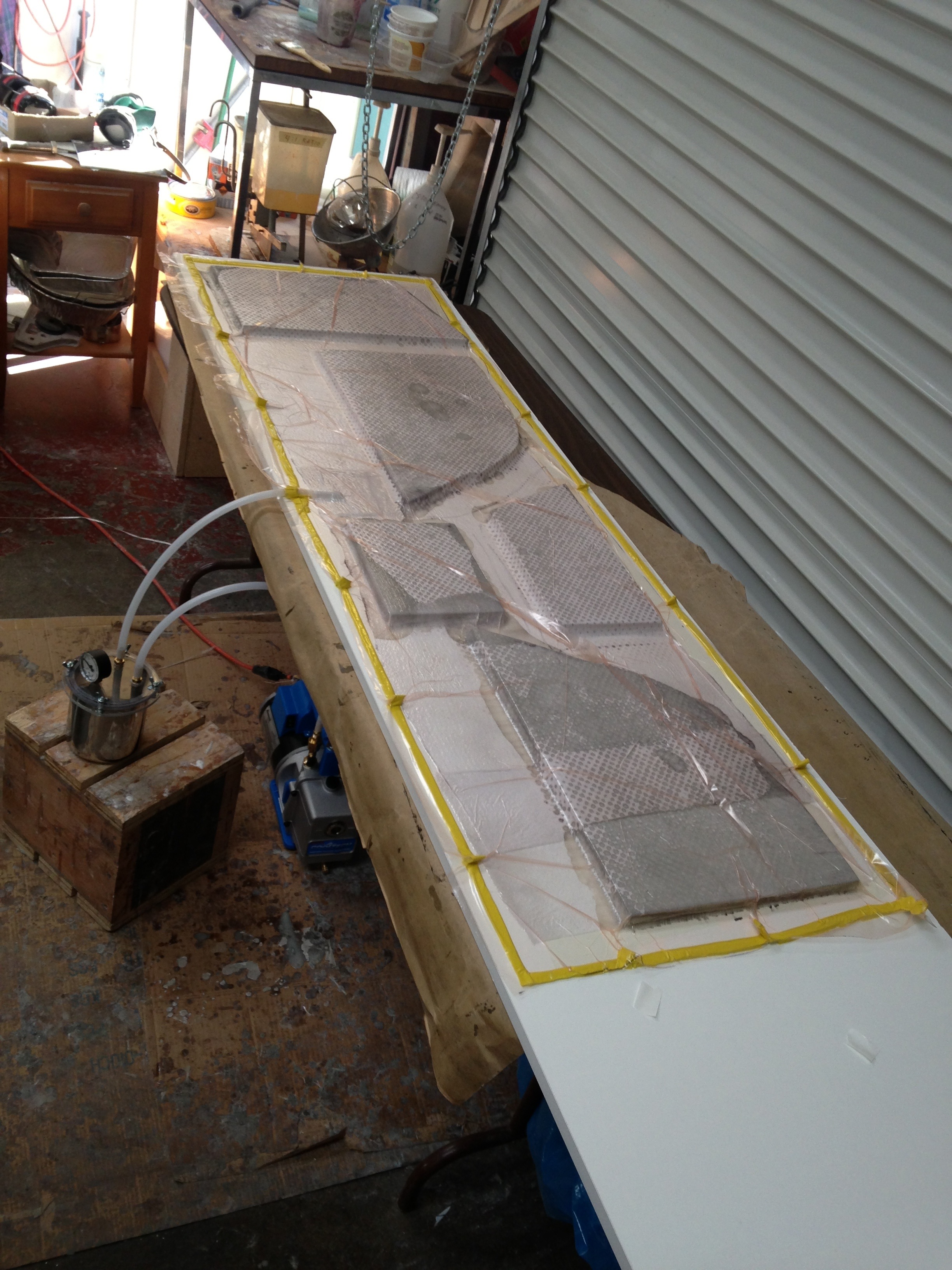 Dad came to the shop today and we unpacked and set up the new vacuum pump and related gear. Thought at first we should try something non-critical like the new box for the back of the errands bicycle, but then we spied the various flat panels for the stern swim steps area. Seemed a low-risk place to start as we taught ourselves the first-timer basics of ‘bagging’…
