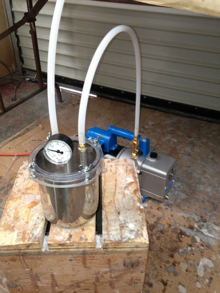 (Resin trap in line between pump and bag – in case the suction hose got too close to resin and pulled it in, we don’t want that getting to the pump!)