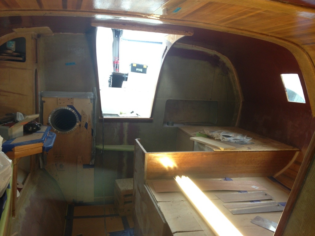 Well, we stopped work on the port beam/float fitting because I found the right woodworker to help with interior fit out. So the past few weeks have been a mad attempt to stay ahead of Mark. We’ve realized that the randomly completed interior woodworking projects from the past are now causing trouble with the primary fairing and painting. So with some frustration I’ve been ripping out or sanding back so of the prior workmanship.