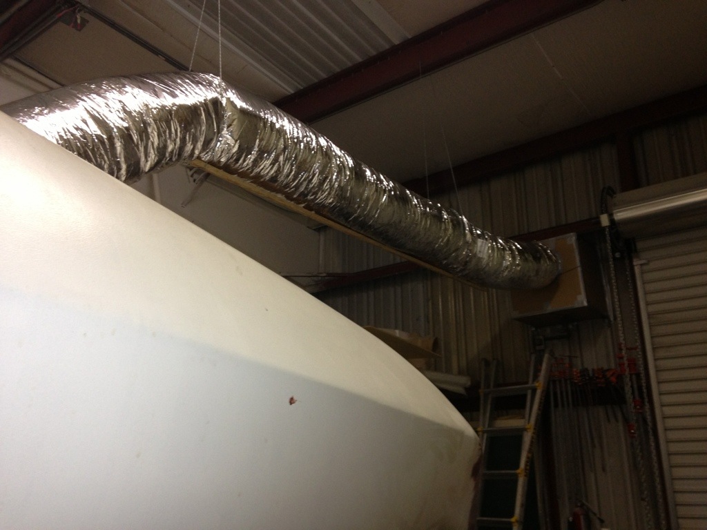 The plywood plug and ductwork hole on the left side of the photo above is the temporary exhaust that’s tied to the shop fan. We were quite lucky to have this big permanent fan over the shop door. It clears the dust and vapors very well.