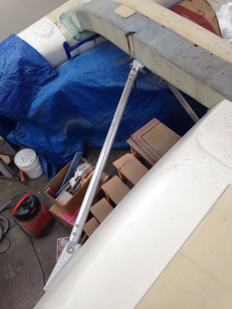 Here’s a clearer shot of the rear diagonal brace behind the aft beam. Very sturdy and designed to keep the whole boat square (prevent wracking that can occur in weaker trimaran designs). Thanks again Dad for cutting all the thick metal tangs that I cemented in to this pole. The epoxy goes in 4 inches, stopped by foam plugs at each end. There will be netting placed in this triangle later on.