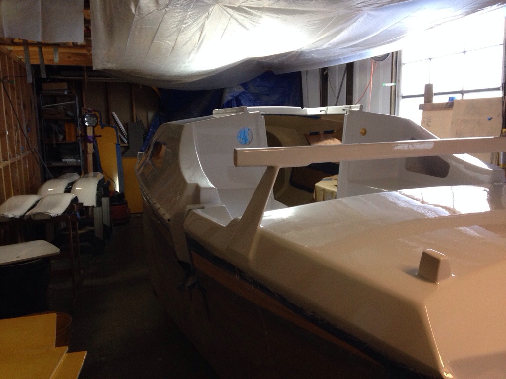 I got to visit Andy Miller’s F22 for a progress report. He’s nearly done painting; a fancy two tone job with hot yellow below the gunwale and white on deck. Here is the finished product of the net lashing rails. What’s not seen is a 1/4″ rod slid inside the tube. The slots give access points where you run a small line around the exposed rod and back to the net lacing.