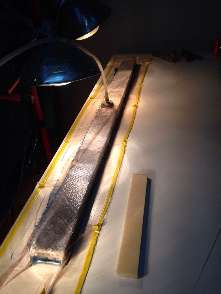At the core of the F39 rudder lies a five foot long 2×4″-sized piece of triple layer carbon laminated high density foam. Started with 3 strips of 5/8″ core material, with one strip planed down a bit as needed to get the total stack to 1 3/4″, including the carbon. All of this math gets a bit tricky as we allow for the fabric weights, especially the foam ‘rebate’ area where the 14 layers of carbon uni-directional will be placed over this high density insert. Lots of scribbles on the note pad, and the final figures penciled on to the plan book for posterity (which means me building the backup rudder in a few months – or maybe Jimbo gets to do it?)