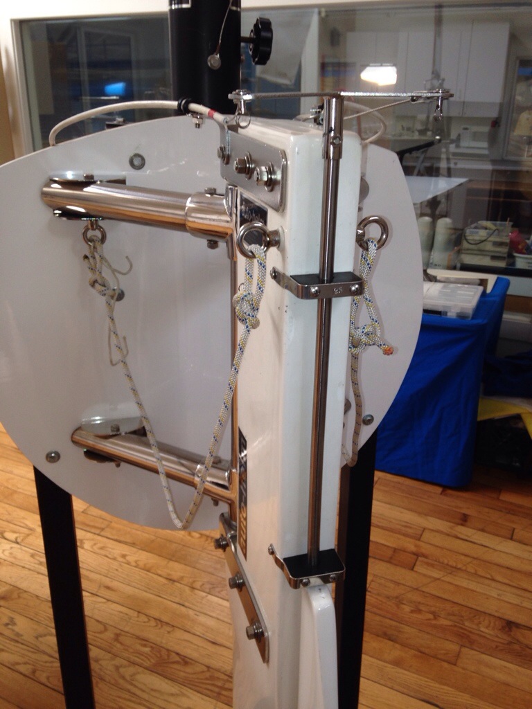Today was a trip to the east bay to pick up the self-steering vane from ScanMar in Richmond. The wind vane component will get mounted atop a new arch at the back of the boat, and the white cables in the photo here are what connect the pendulum vane to a trim tab on the back of the rudder. I didn’t photo enough of the air vane at the top to get a complete picture, but this is just the start of this story.