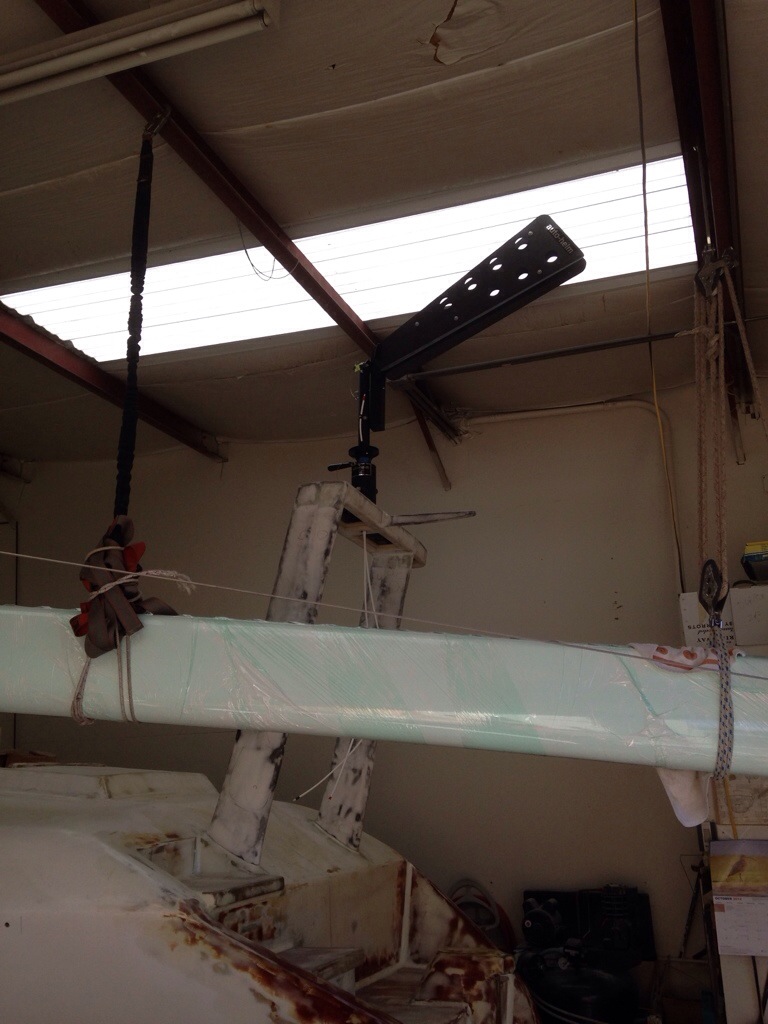 The shop neighbors who were perplexed by the stern tower were satisfied now by seeing the self-steering wind vane installed. It’s the brown unit in these photos. The actual vane that gets pushed by the wind is in a deeply “reefed” position, tilted way back to fit under the skylight ceiling.