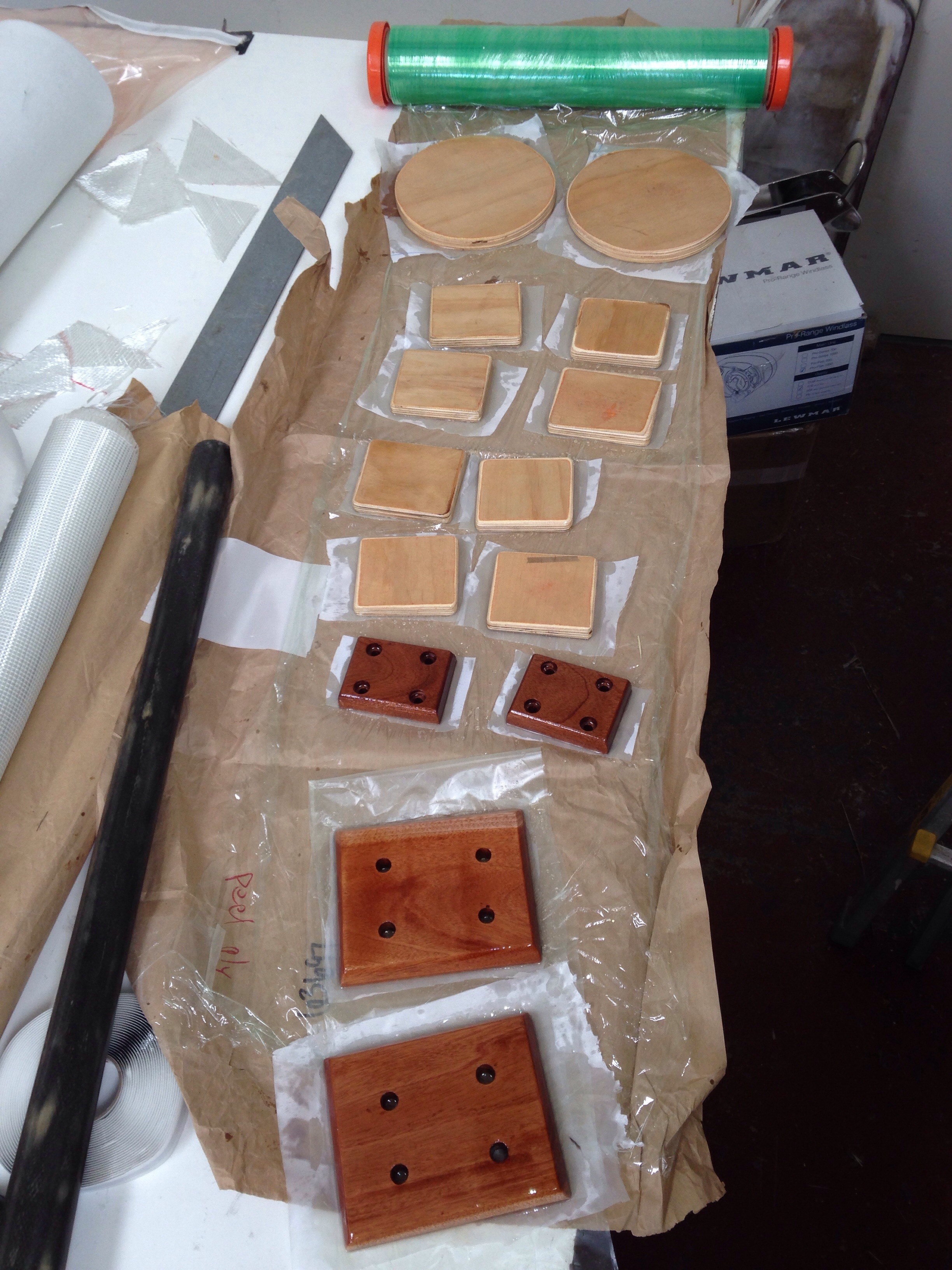 We were going to make fiberglass backing plates or buy G10 sheet (yikes expensive), but decided hard woods would be a better fit. So, hardware mounted where the backing washers & nuts are hidden from sight get 3/4″ marine plywood and pieces in view inside the cabins get chunks from a hard mahogany stock. Here are some plates to back up winches, docking cleats and pad eyes.