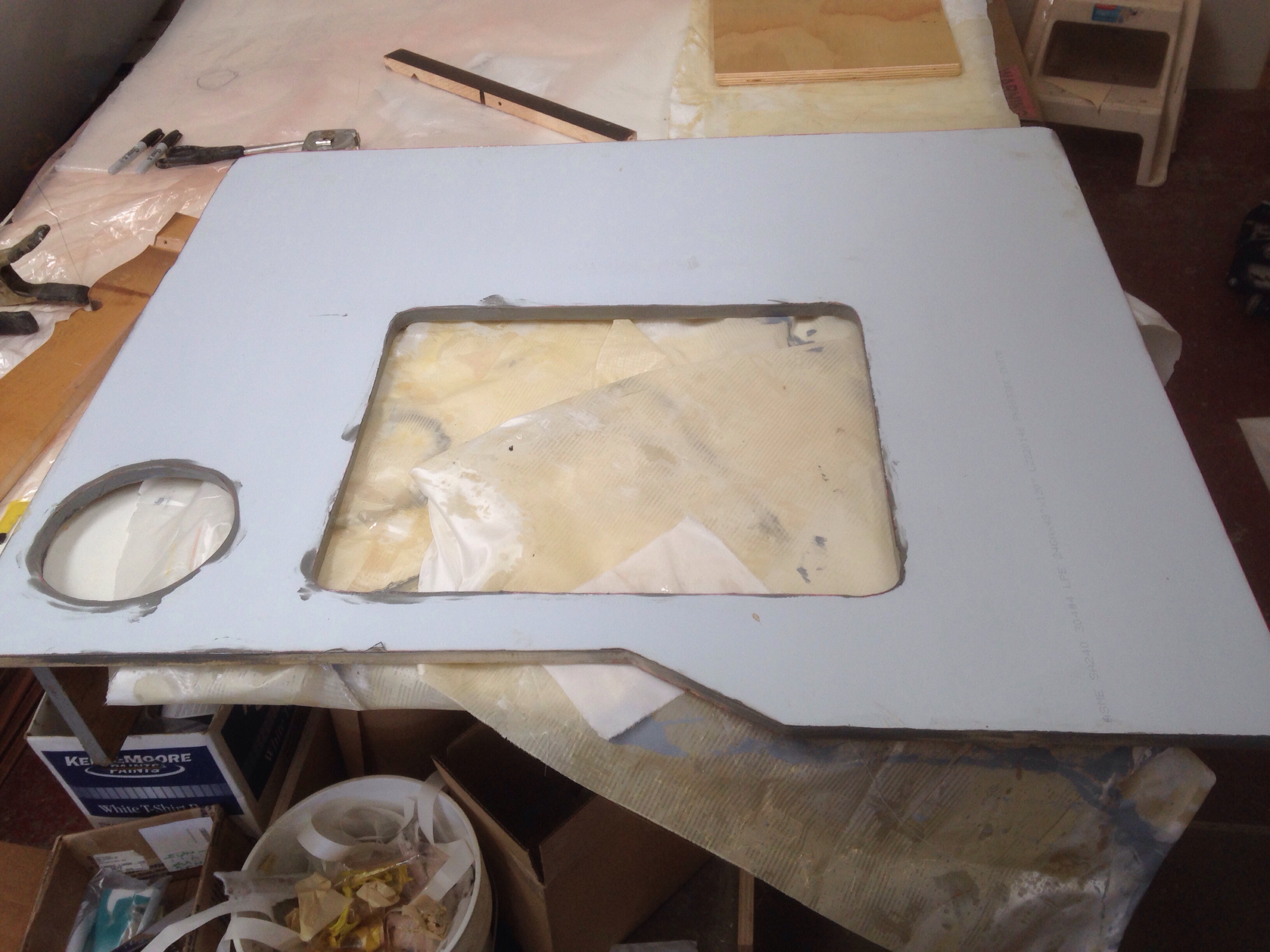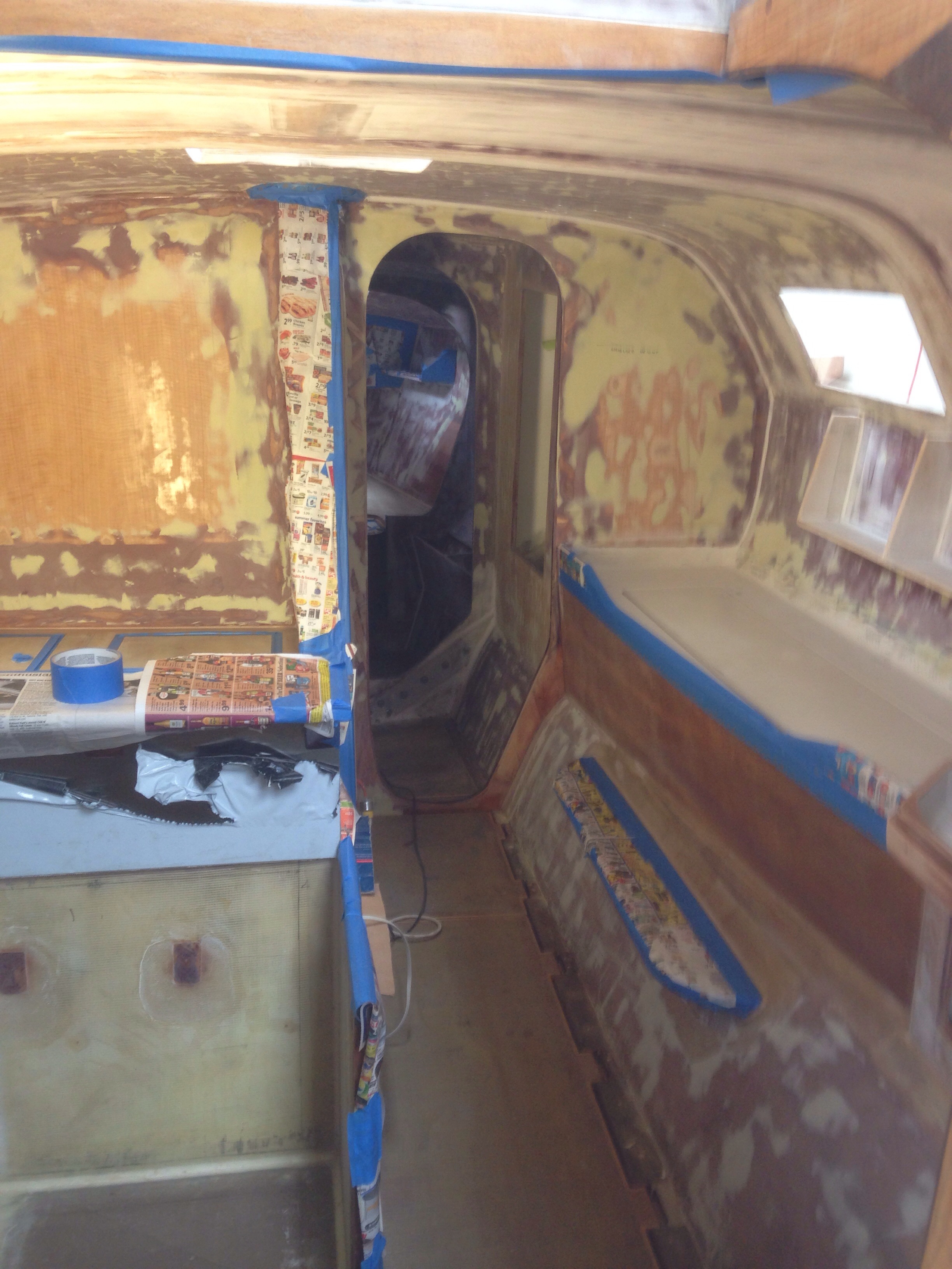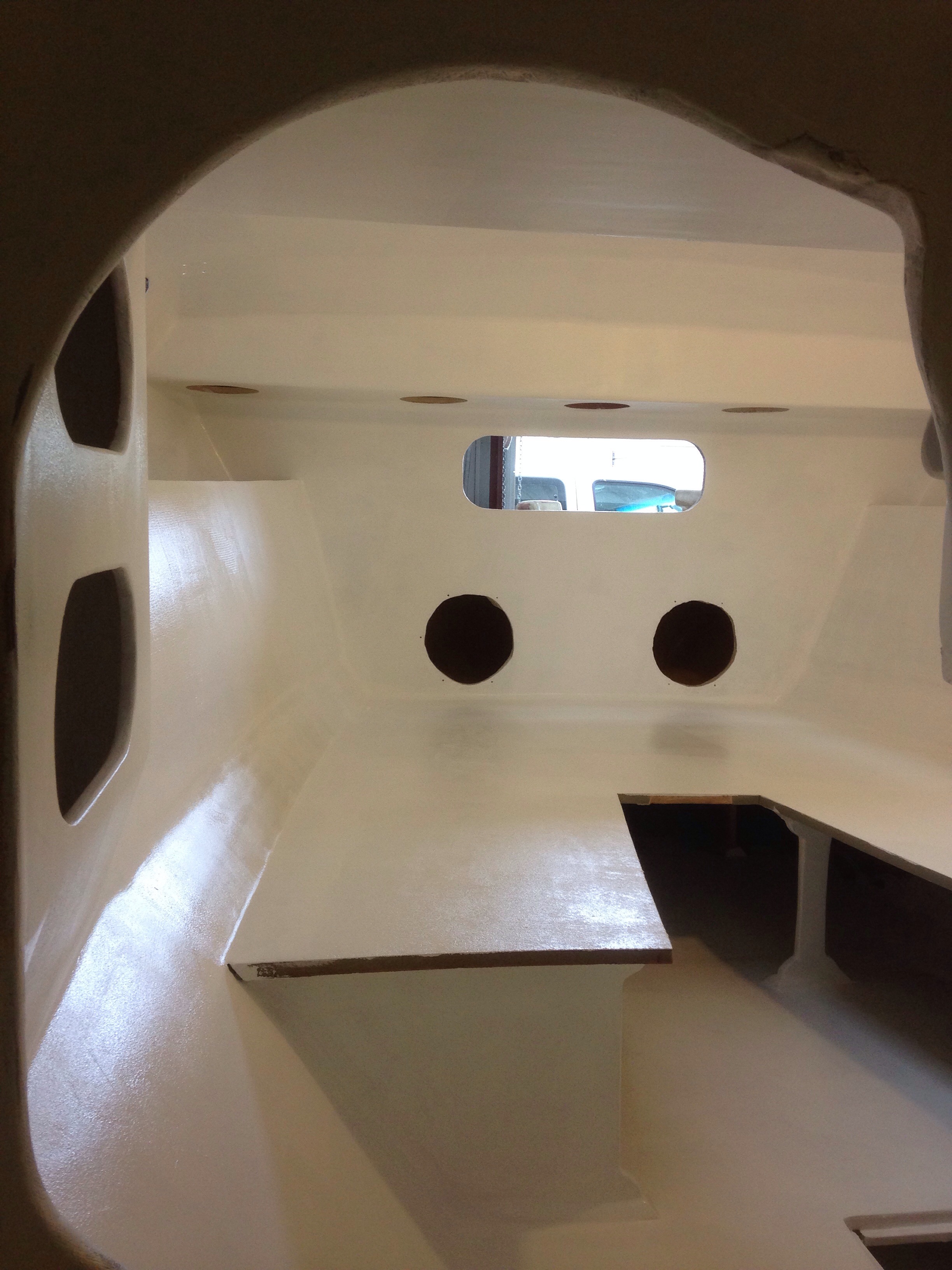 We looked up the other day, wiping the eyes from a big cloud of dust, ears ringing from the sanding machines… And realized the interior fairing was DONE! Put down the sandpaper, clean out the boat and go get some primer. Here’s where things stood Friday evening to start Memorial Day weekend.
