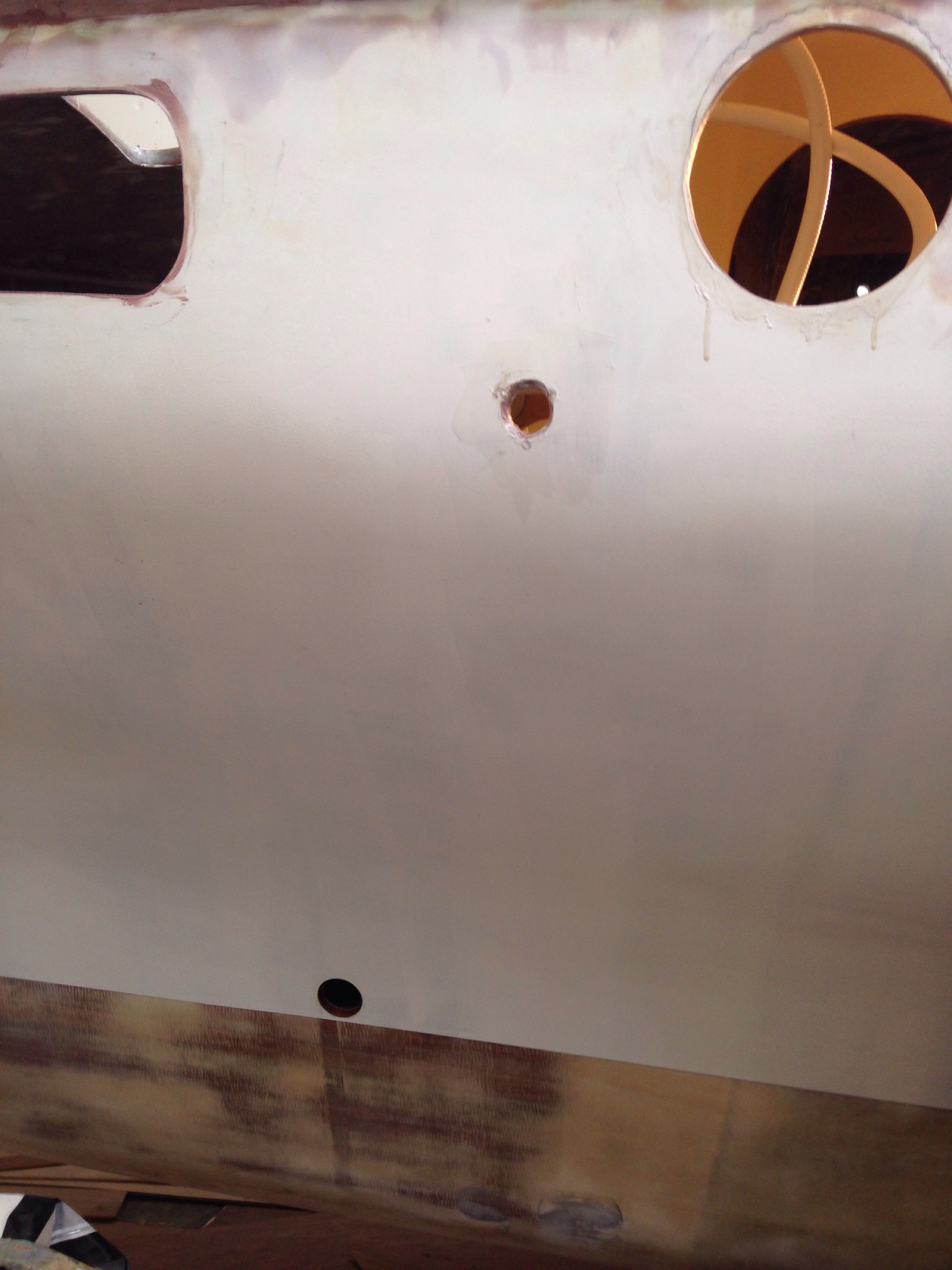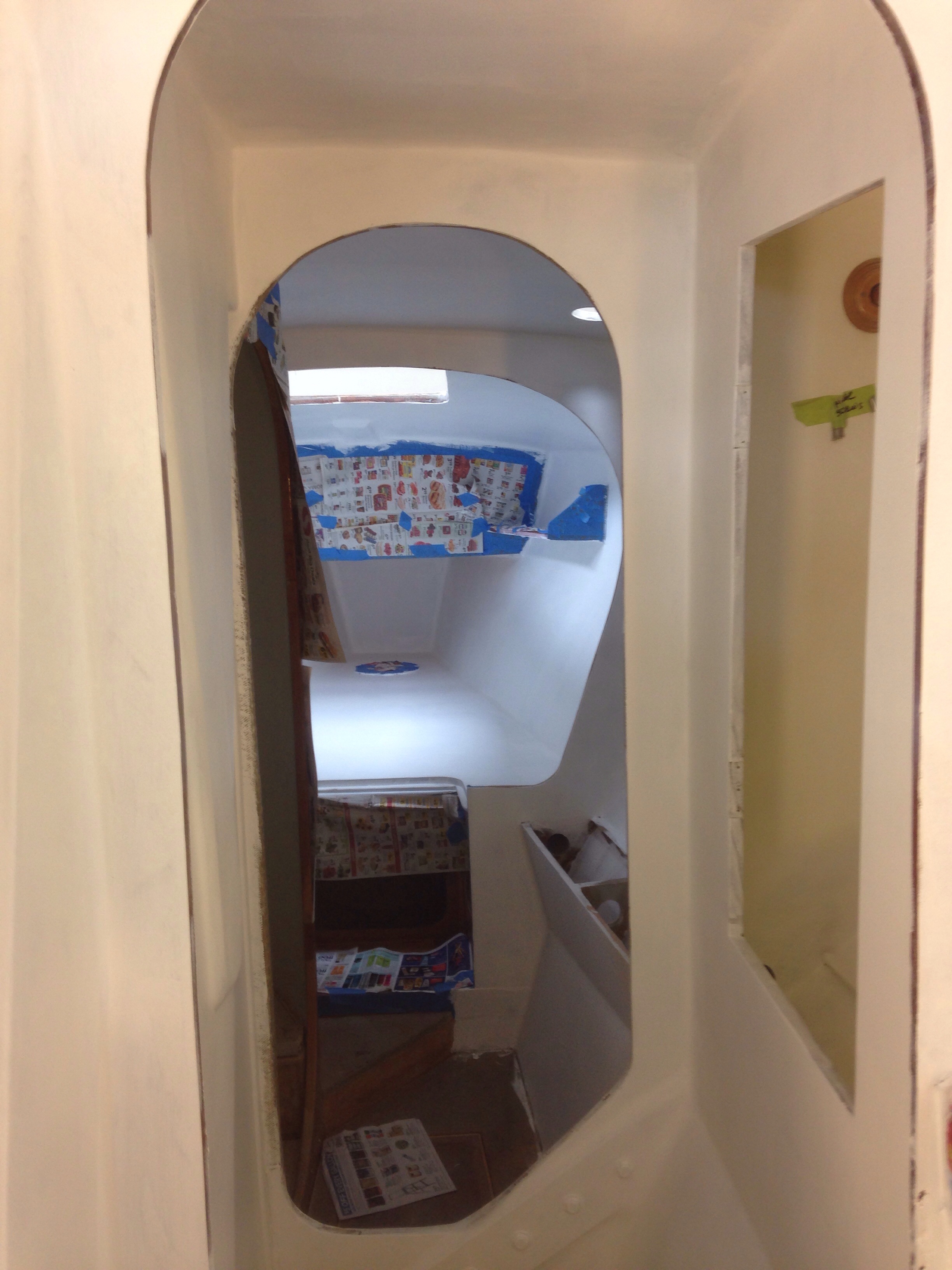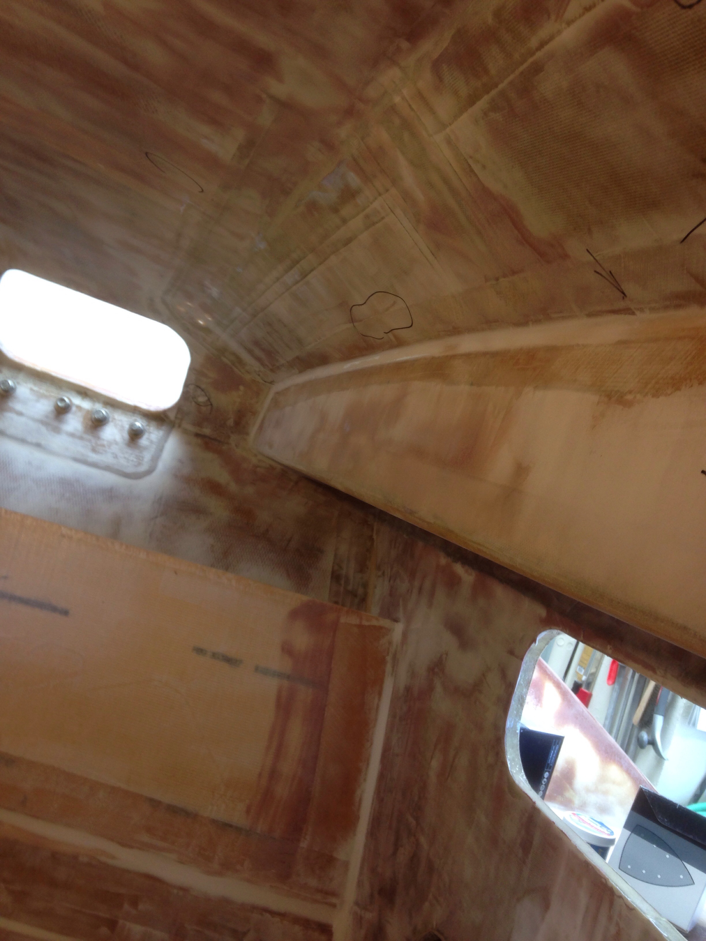 We looked up the other day, wiping the eyes from a big cloud of dust, ears ringing from the sanding machines… And realized the interior fairing was DONE! Put down the sandpaper, clean out the boat and go get some primer. Here’s where things stood Friday evening to start Memorial Day weekend.