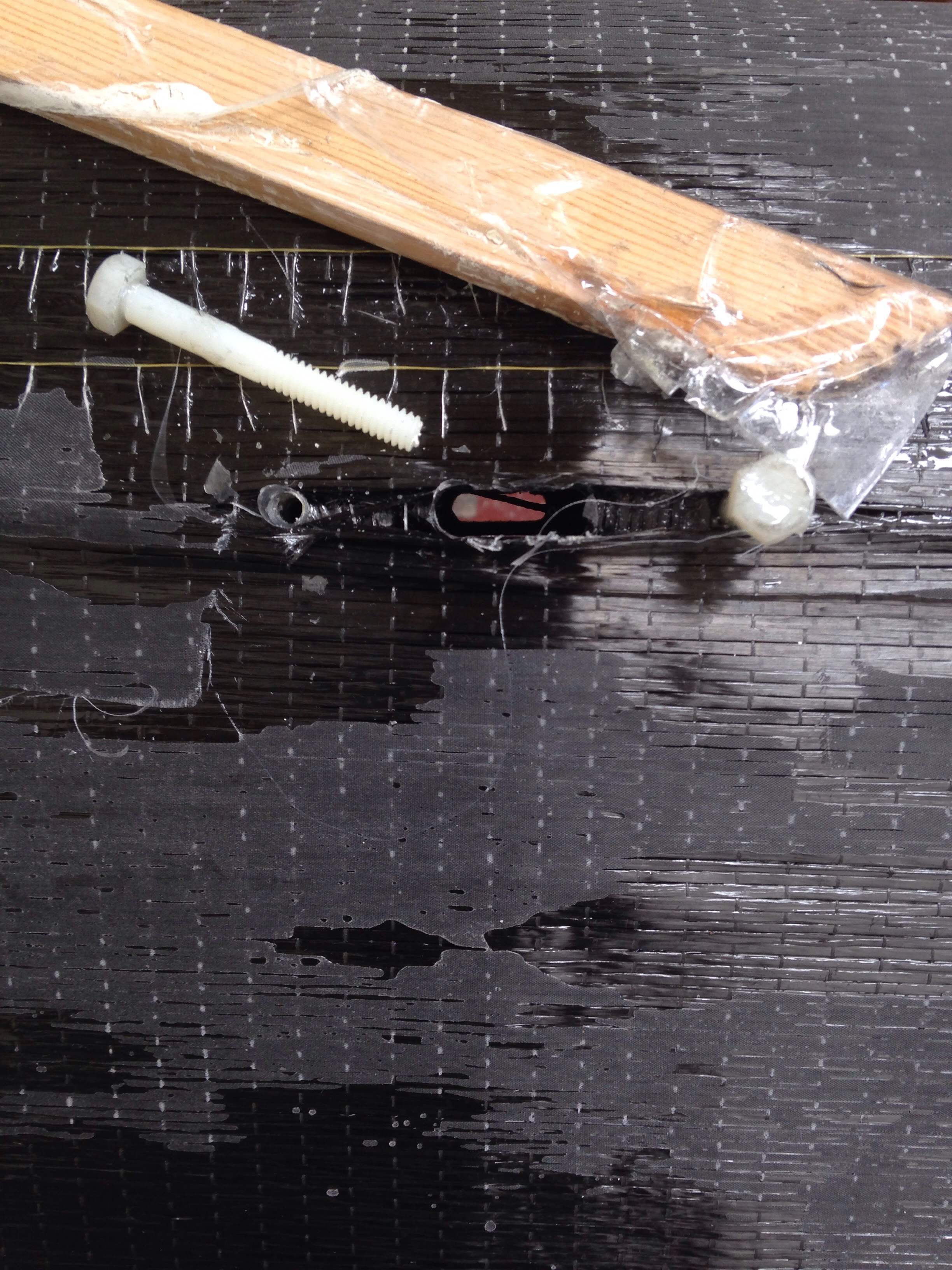 The longitudinal layers are coming on 10.4″ wide rolls of 6oz IM7 (822ksi) carbon uni. 50′ X 3 strips of 10″ to get around the 30″ mast X 4 layers = 600′. Soller has 300′ rolls at $1.29/ft.