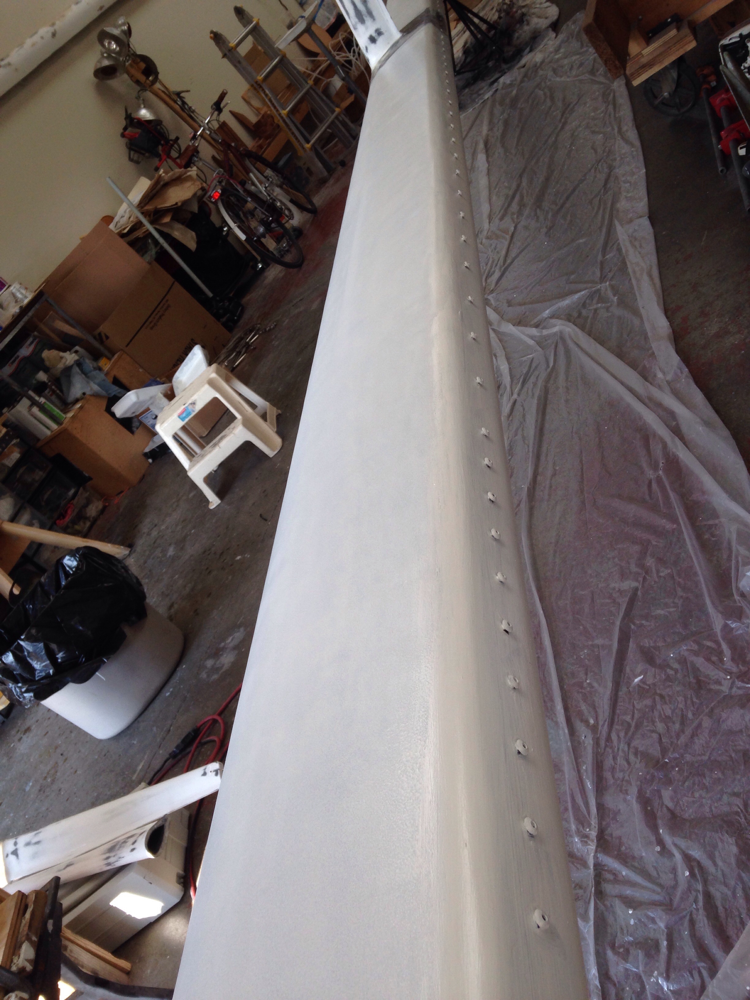 So here at the end of August “the big parts” are all on trailers, stored and ready for launch – floats, mast, beams and daggerboard. The main hull needs a week of final glassing bits and fairing, and all of its exterior paint. The interior is 95% prepped for final paint, which will be sprayed this week. After paint is done both inside and out, we’ll do wiring then plumbing and finally install all the deck hardware. It’ll be a very busy September in the shop.