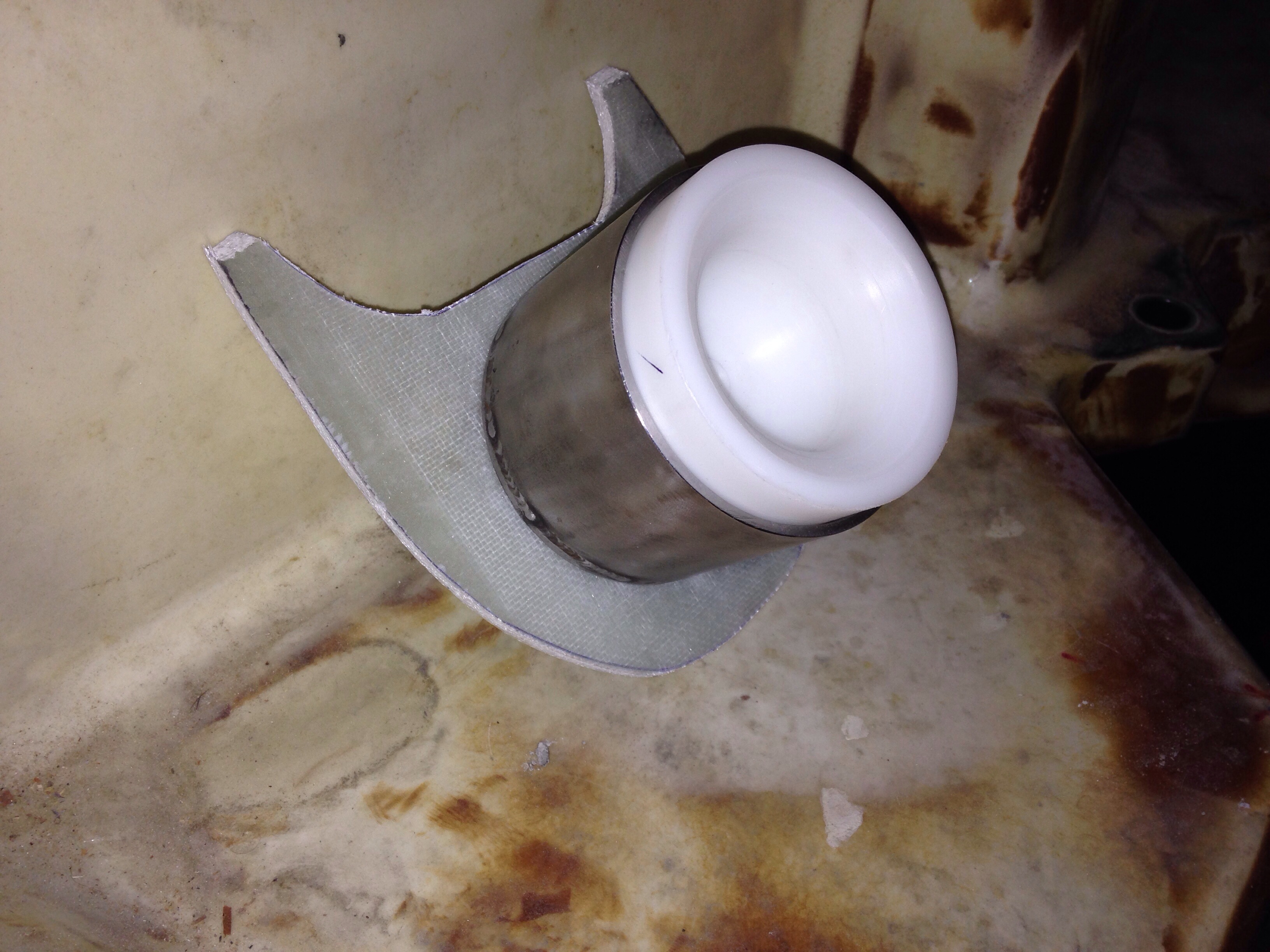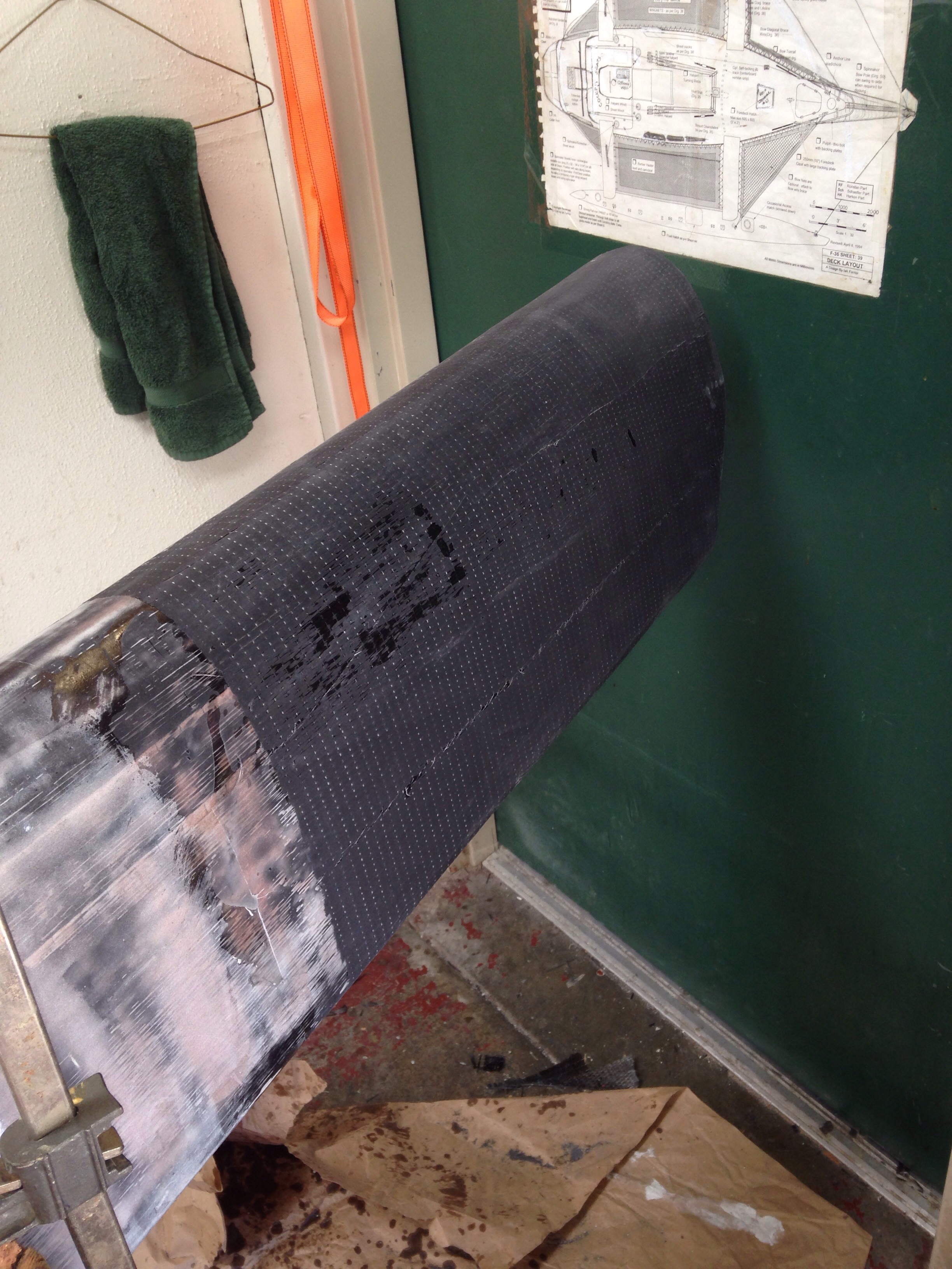 The cap was made by laminating a dozen layers of 12oz under vacuum on the work table. The cup has bolt head recesses cut inside – the backing nuts will be entombed after the cap is bonded on so we will secure them thoroughly.