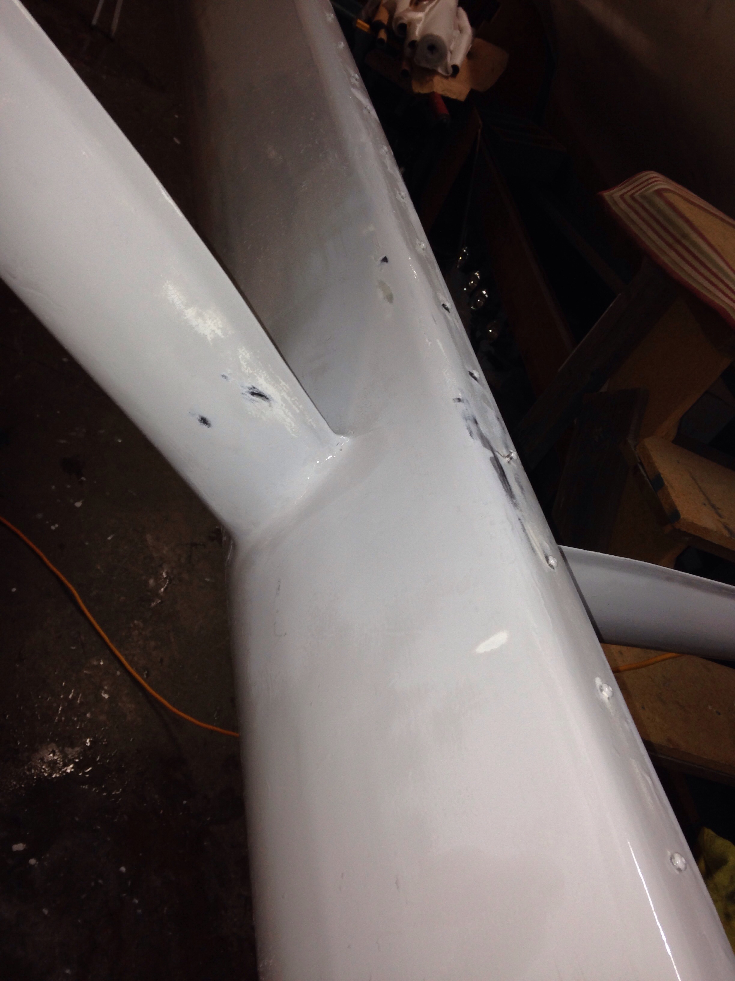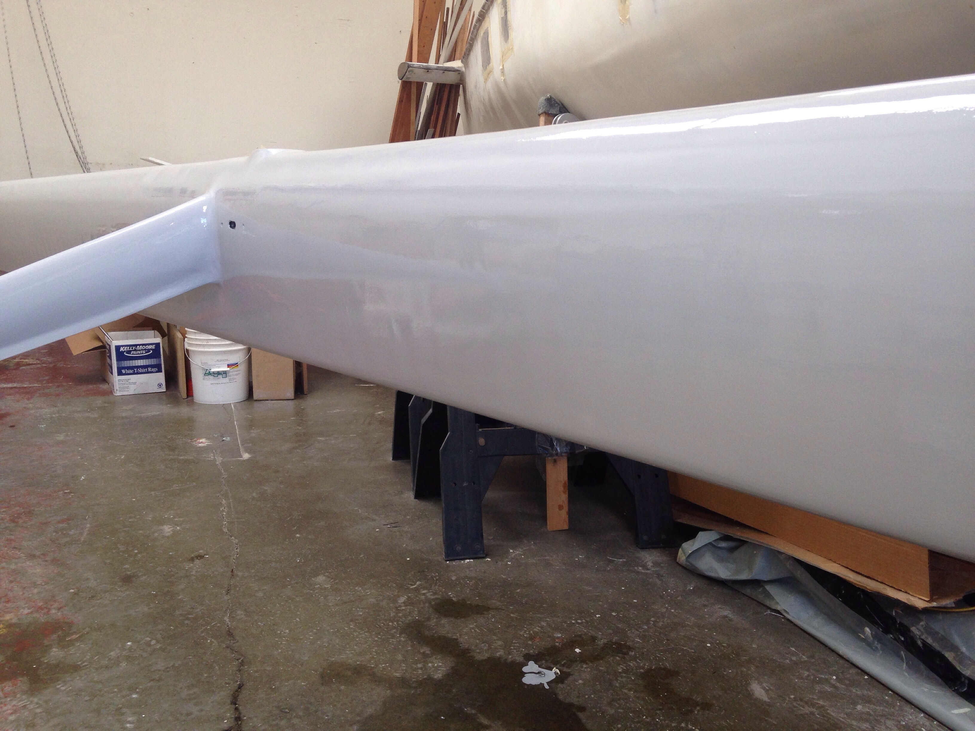 This has been good learning of the roll & tip method, and more importantly how imperfect fairing or priming shows through. If the surface isn’t perfect before painting, the paint ‘ain’t gonna hide it, but rather it accentuates the blemishes. And yesterday we learned that trying to work all angles vs gravity is tricky, as in painting around the whole mast at once. The face that was pointing up looks great (those photos above), but what had been facing the floor ended up with some paint blotches and runs. Pretty frustrating tonight to be sanding away money and causing repaint work tomorrow. See the after-wet-sanding spots from tonight.