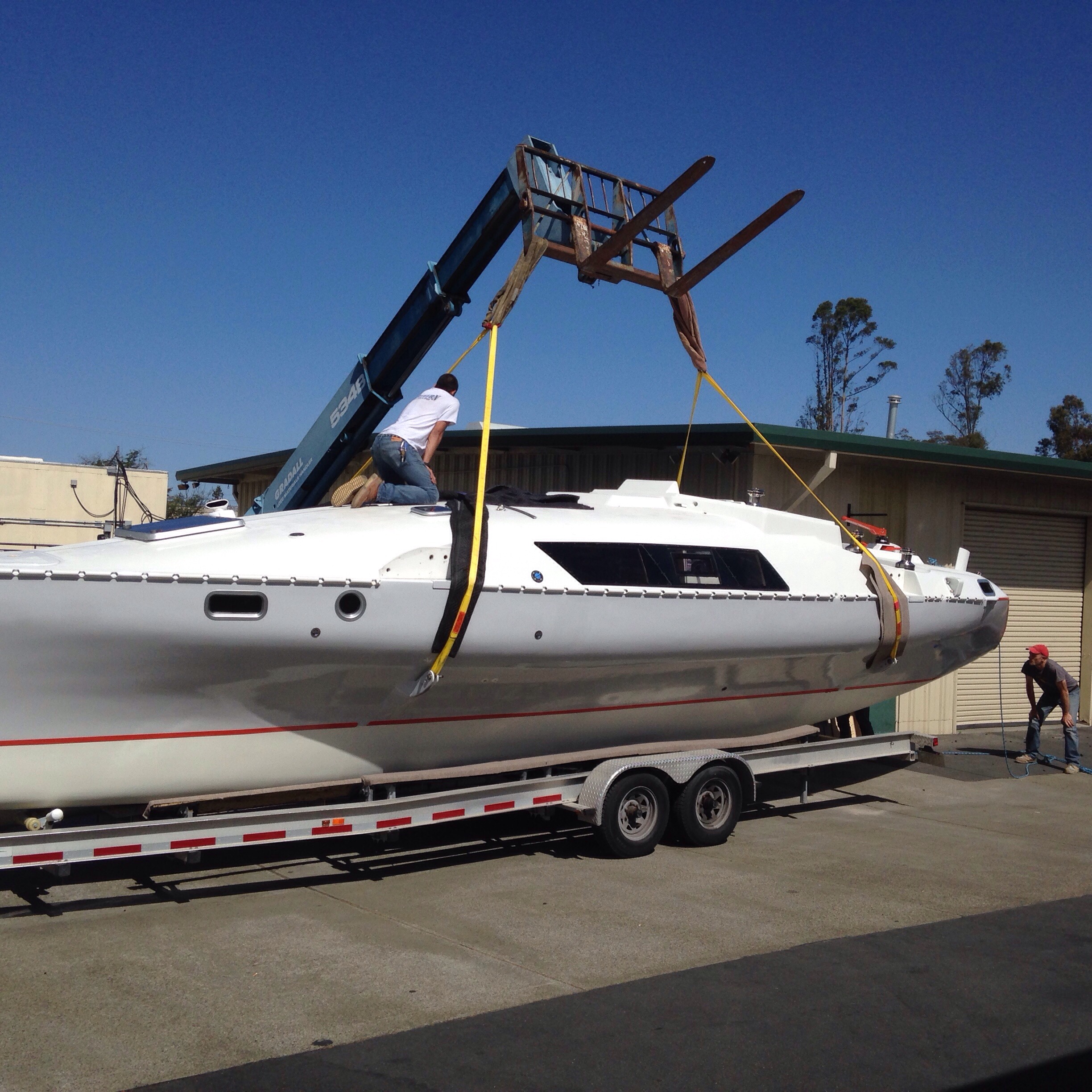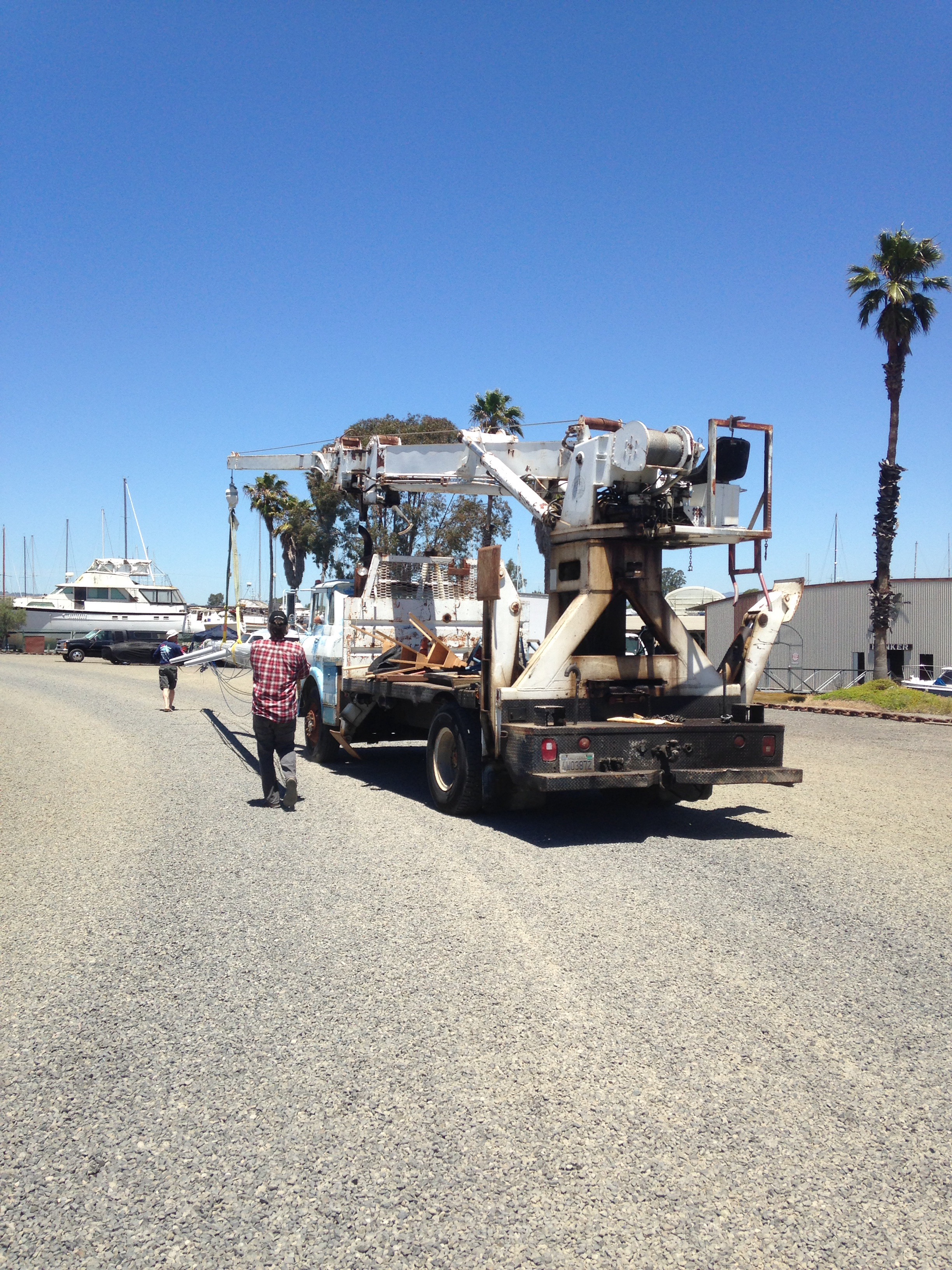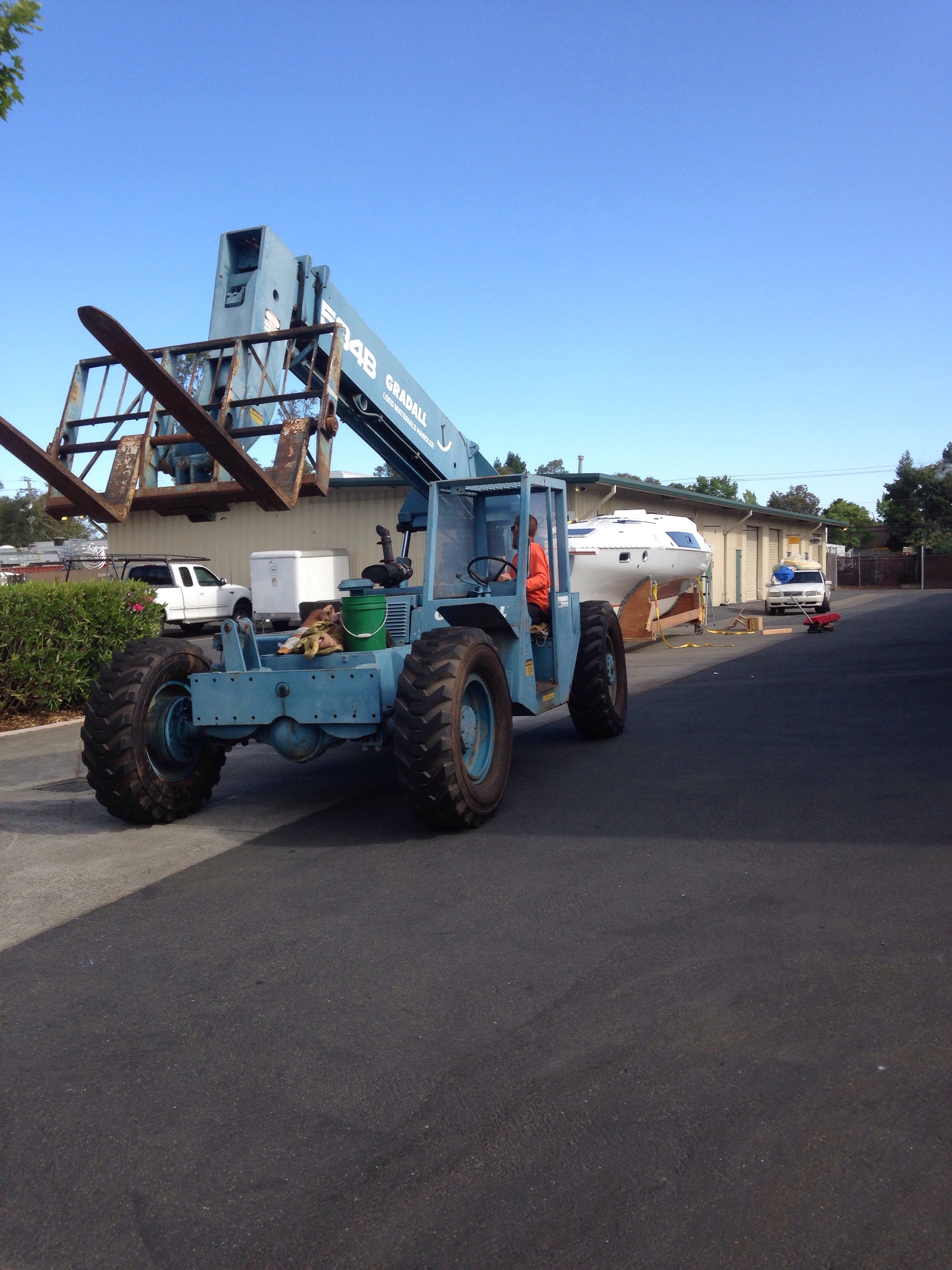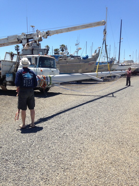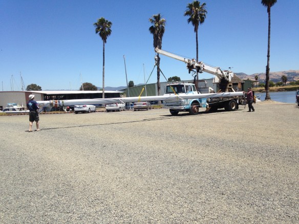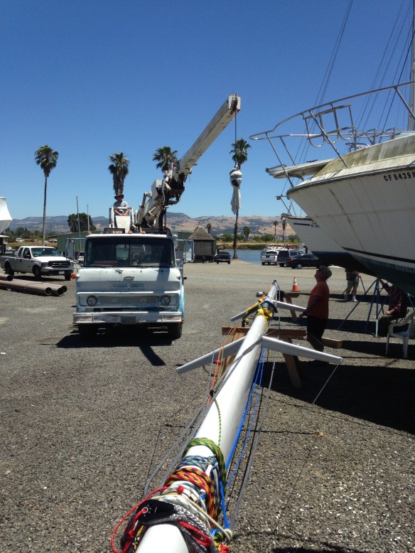 The straps for walking it across the yard very different from the vertical lift, and we had transition time while the crane sat at the water and I went to fetch the boat. Standing it up was painless, especially due to the skill and equipment of the Napa Valley guys.