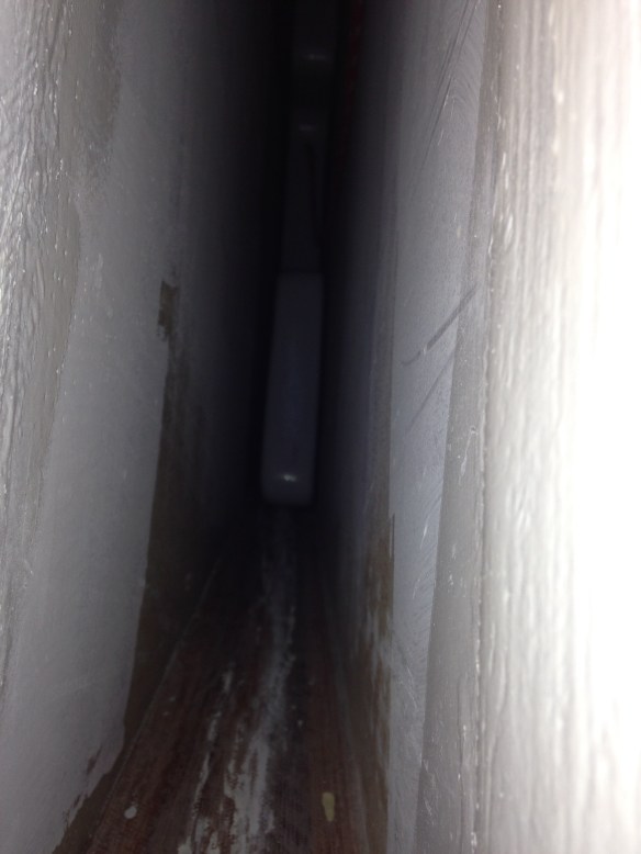 If that’s hard to see, it’s because it’s ALL THE WAY DOWN in this shop. Yea, the mast step can go back in over this trunk. This board is big. It floats, so moving it through most of its travel is pretty easy by hand, but the last foot or so up or down needs a winch. If we’re needing to pull it up fast because of an obstacle, simply freeing the down line will pop the board up three feet in a few seconds.