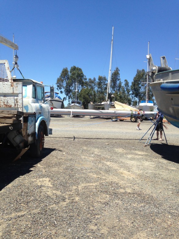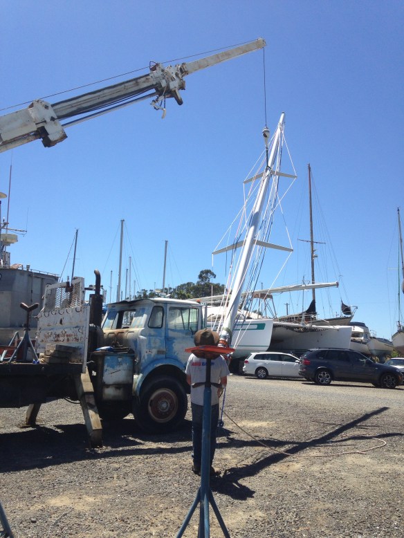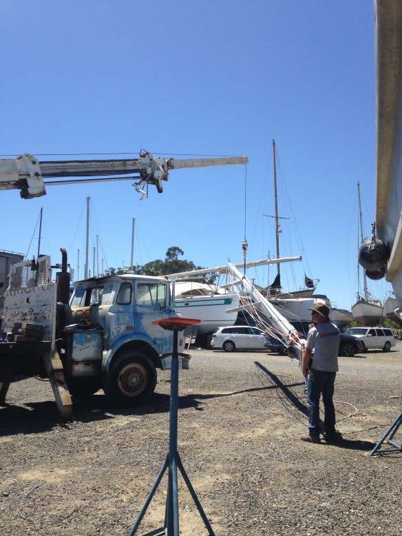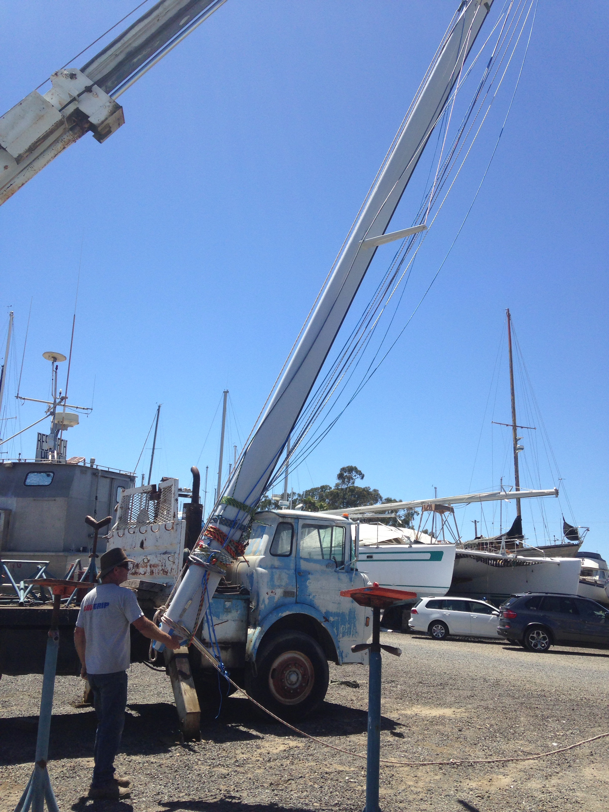 With the dagger solved, attention turned to prepping the mast. ‘Dressing’ took about 3 hours by RickW, RickH and Dean. Holding the mast upright is highly dependent on one huge shackle on the front face near the top. Here’s the pin coming in from the port side into the Jesus shackle. (Yes we pray this thing never gives way)