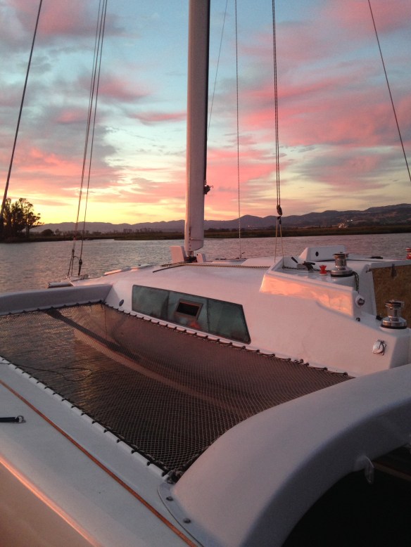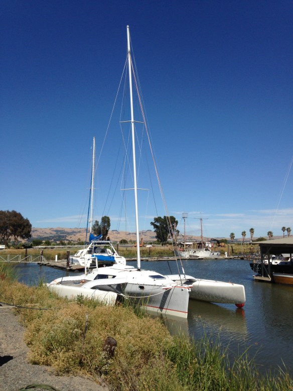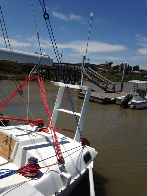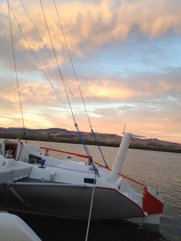 A peaceful sunset to celebrate the builder-now-driver’s first solo manuevers, docking Ravenswing back at CharlieJ’s after a big day getting the mast stepped at Napa Valley Marina. We again had a nice big crew starting at 8am, and by 3:30 the stick was upright and everyone else rolled home. I had a couple of quiet hours to finish standing rigging install chores, all the while fretting the wind pinning the boat up against the reeds and muddy bank beneath the crane. (How would we motor out of this tricky spot???)
