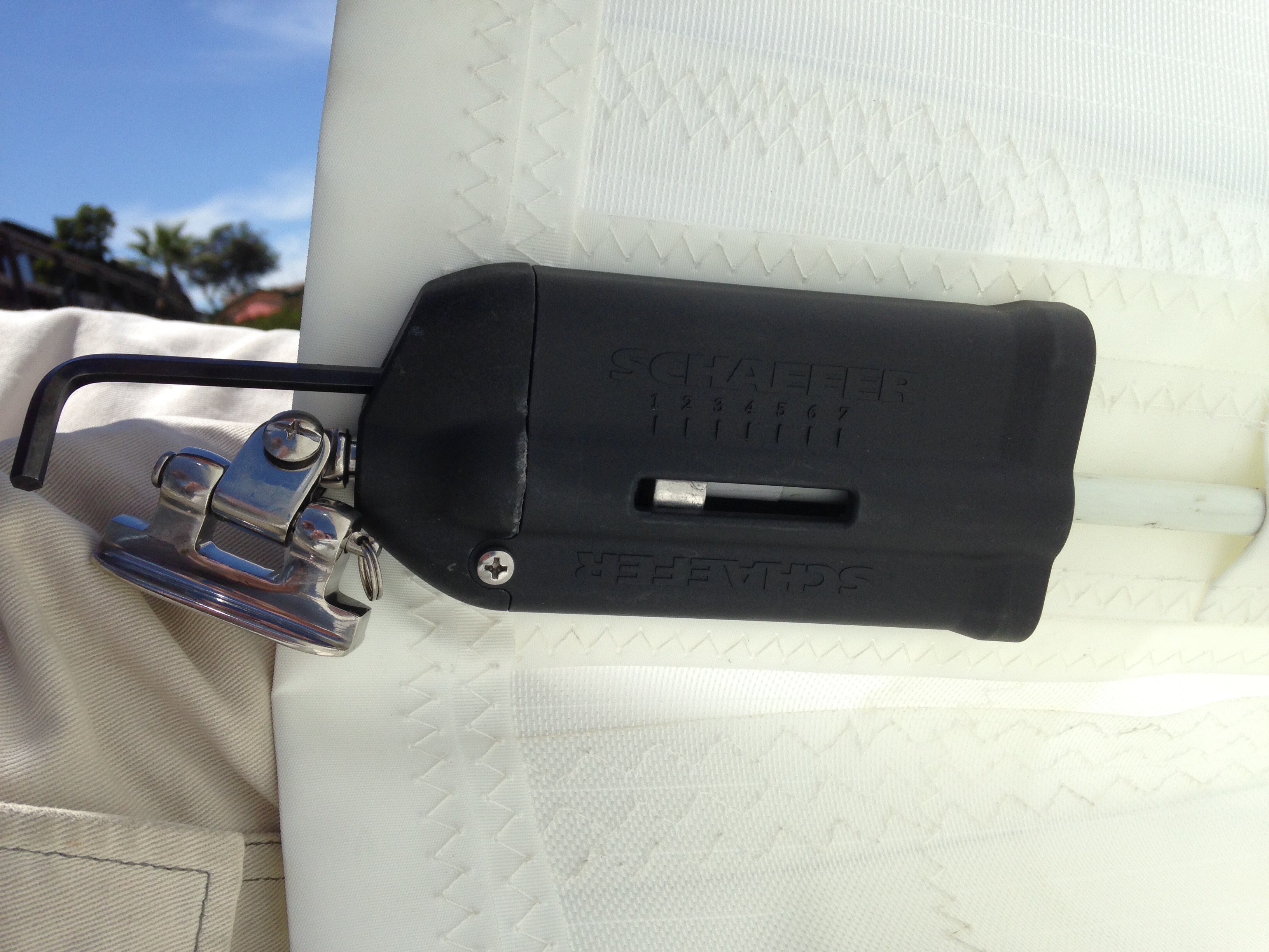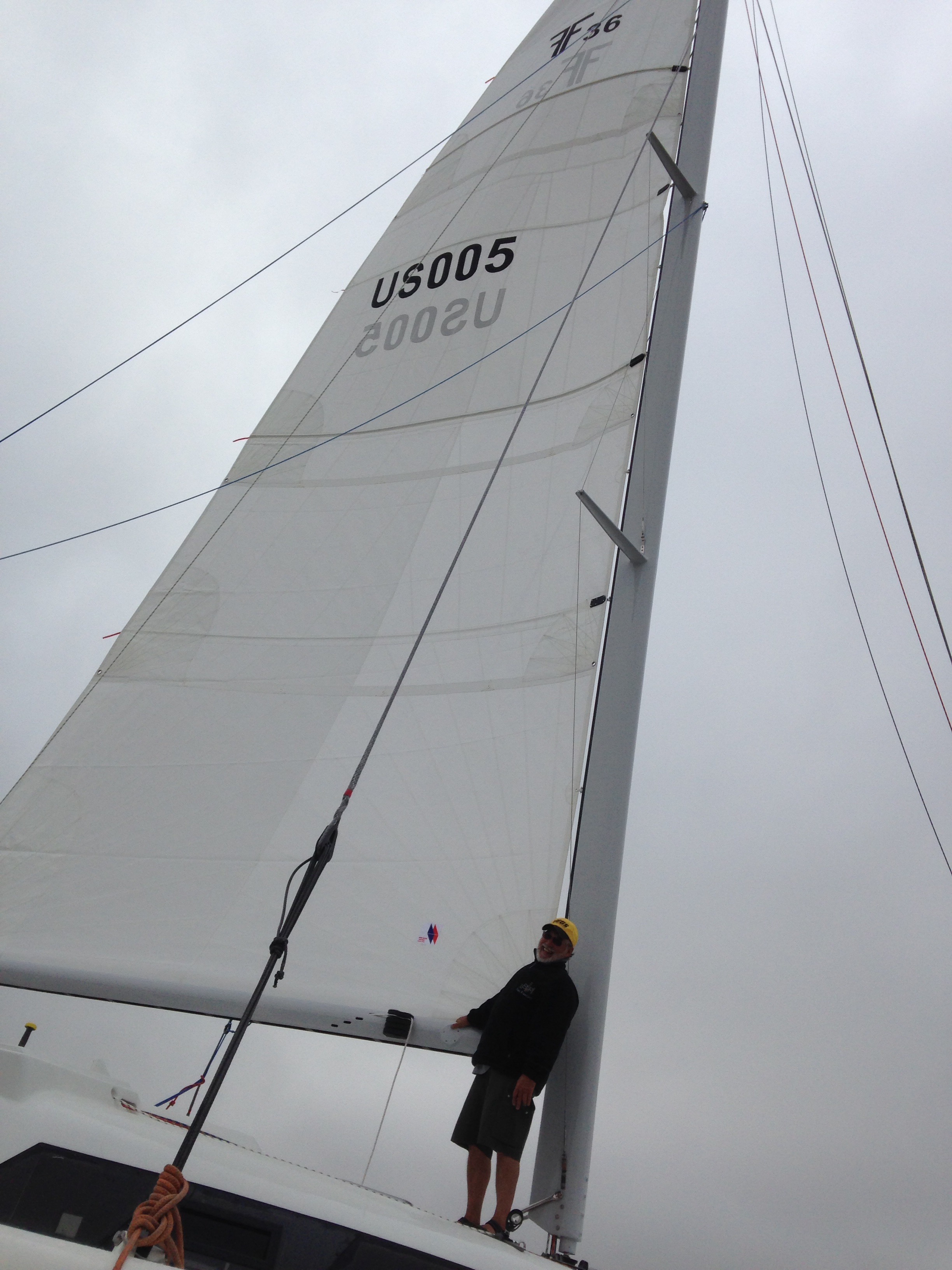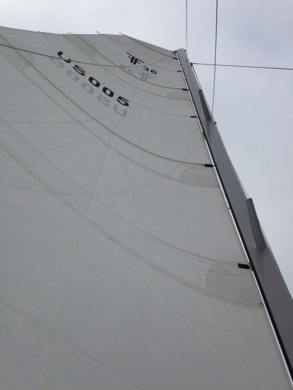Yard manager Mike had to stand there 15 mins holding the mast in the rotator ball while we struggled with lacing the 1/4″ spectra through the lacing eyes. But a couple of small trims, cussing and “just push harder!” Got it done.