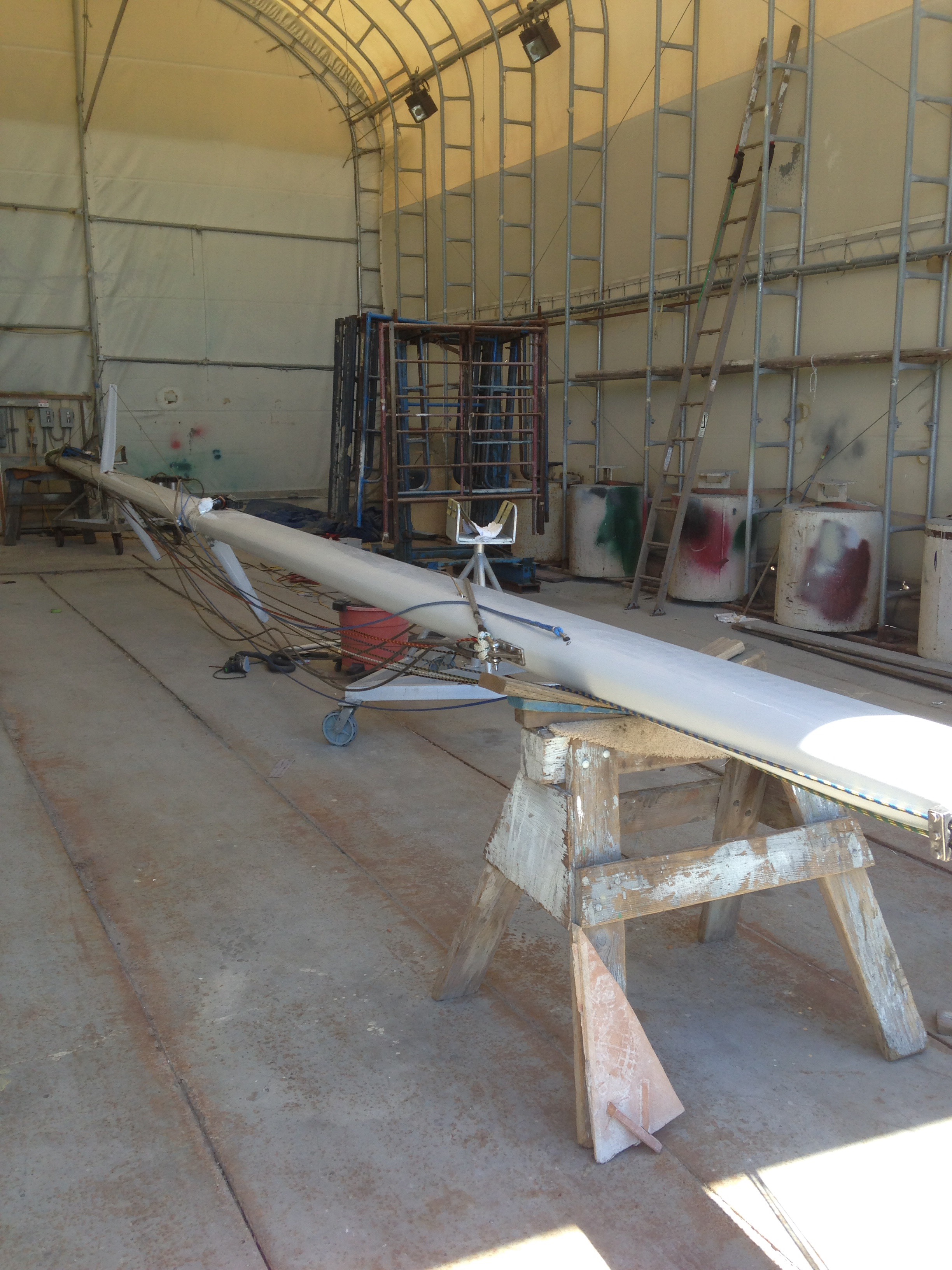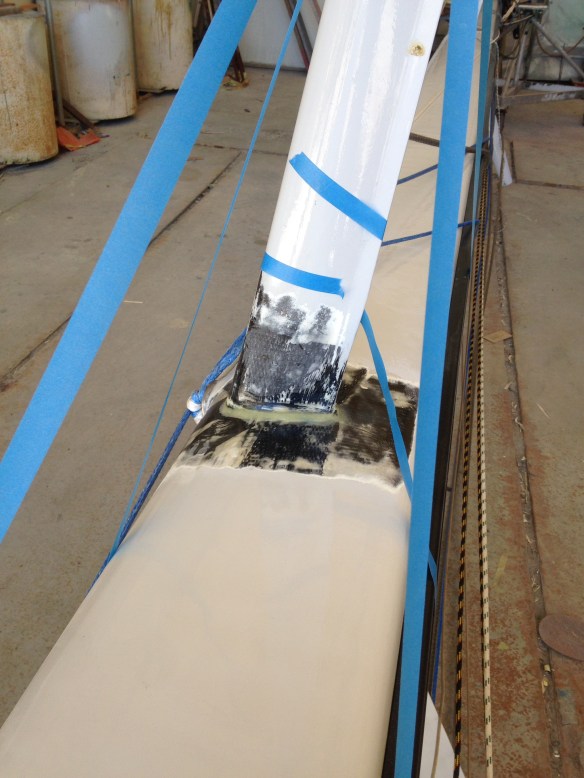 Ouch – what you’re seeing are the too-thin Carbon uni laminates used to bond the spreaders back on after the mast rebuild last year. In retrospect I was too concerned about blending in those spreaders, keeping it light. This time we’ll beef up those corners.