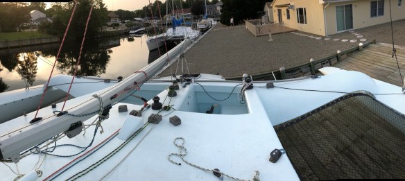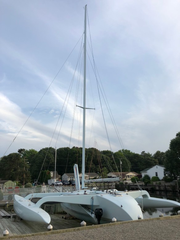 Y’all have read our frequent references and thanks to Keith at Skateaway Design for his help in outfitting and optimizing Ravenswing. Today we’re going to talk about HIS boat, Skateaway. I had the pleasure of visiting Keith & Val’s waterfront property on the NJ coast for a sail on their catamaran and a thorough walkthru of the amazing trimaran Skateaway. They had successfully built other ocean boats before this, but Skateaway seems to me to be a life-achievement project. Rarely do you see someone think through their use-objectives, design to those needs, personally build in very high quality, execute and refine year after year, and actually use the object for many enjoyable years.