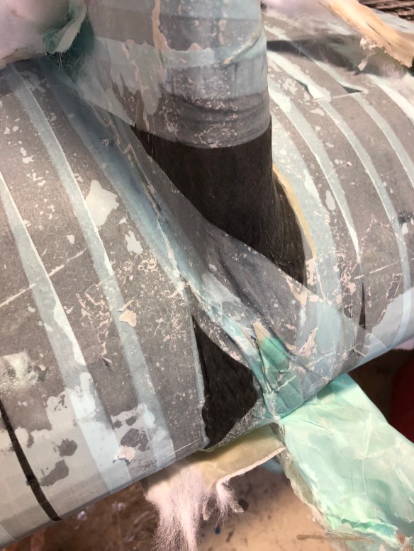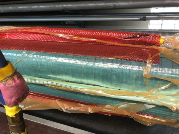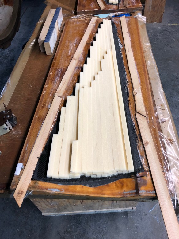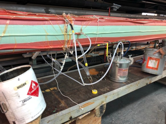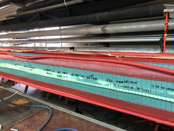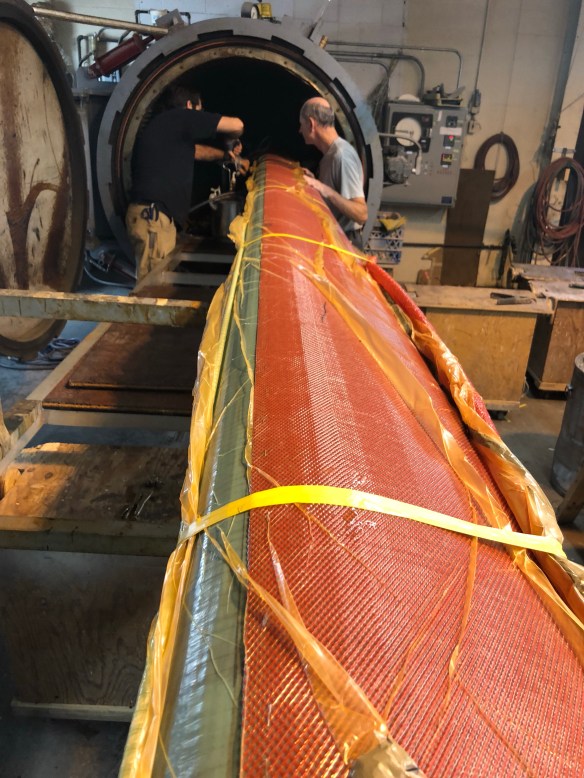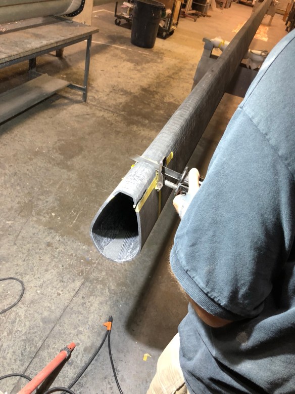 For you fabricators reading this, I was impressed how these guys achieve resin saturation and excess absorption into the bleeder cloth by using pressure from tightly wrapped packing tape and clamps, where vacuum bagging is impractical. We are using this technique to apply the outer carbon reinforcements to the mast head, the gooseneck and six padeye bases along the mast. They also had me do that to the spreader trailing edge wraps last night. See them ‘bandaged up’ and then unwrapped below.