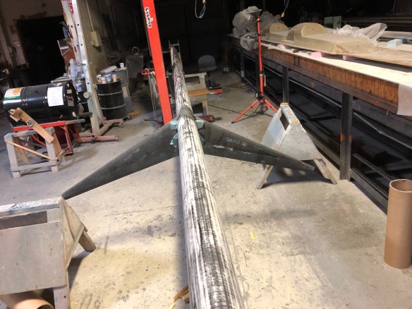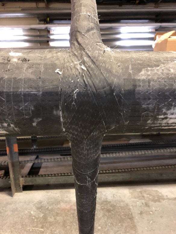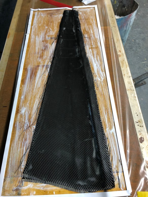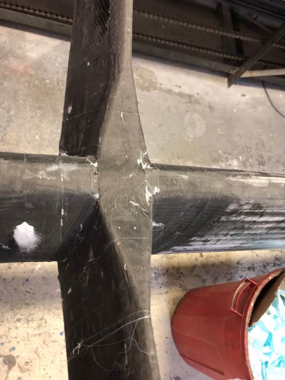 That’s 3 layers of 11oz carbon twill at 0-90 perpendicular to the mast, 3 more at 45-45 in the direction of pull, then two of the heavy double braid ‘primary straps’. I’m leaving those visible in the final paint job.