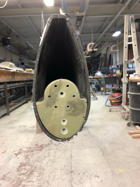 If you knew our first mast, that six-hole pattern at the bottom is where the same steel cup will be screwed in to the mast. Here’s the view the halyards will see – very clean access around this foot piece, and ZERO protrusions into this mast above the foot all the way to each halyard’s exit. No wires, no cross bars, no bolt heads. Our design goal was a totally clean inside to minimize any halyard chafe on extended ocean passages.