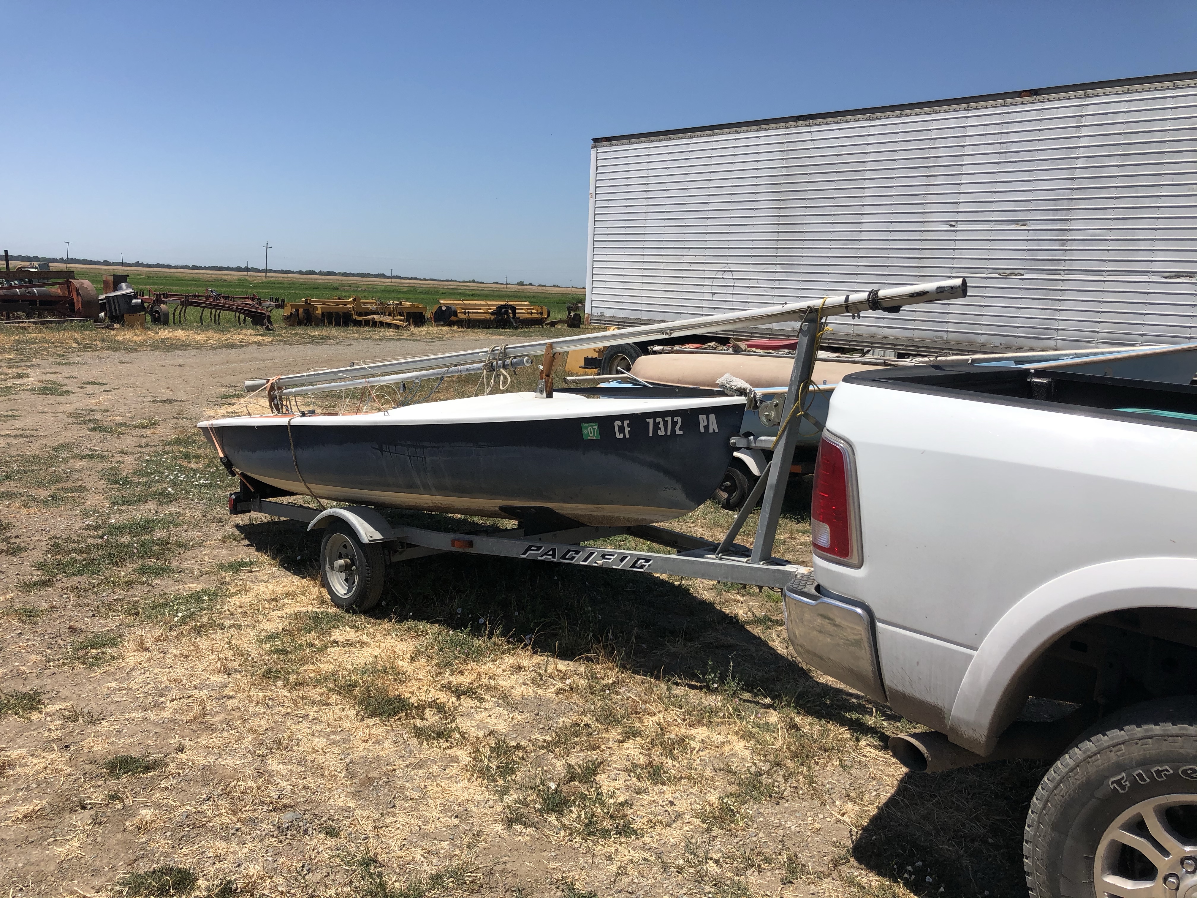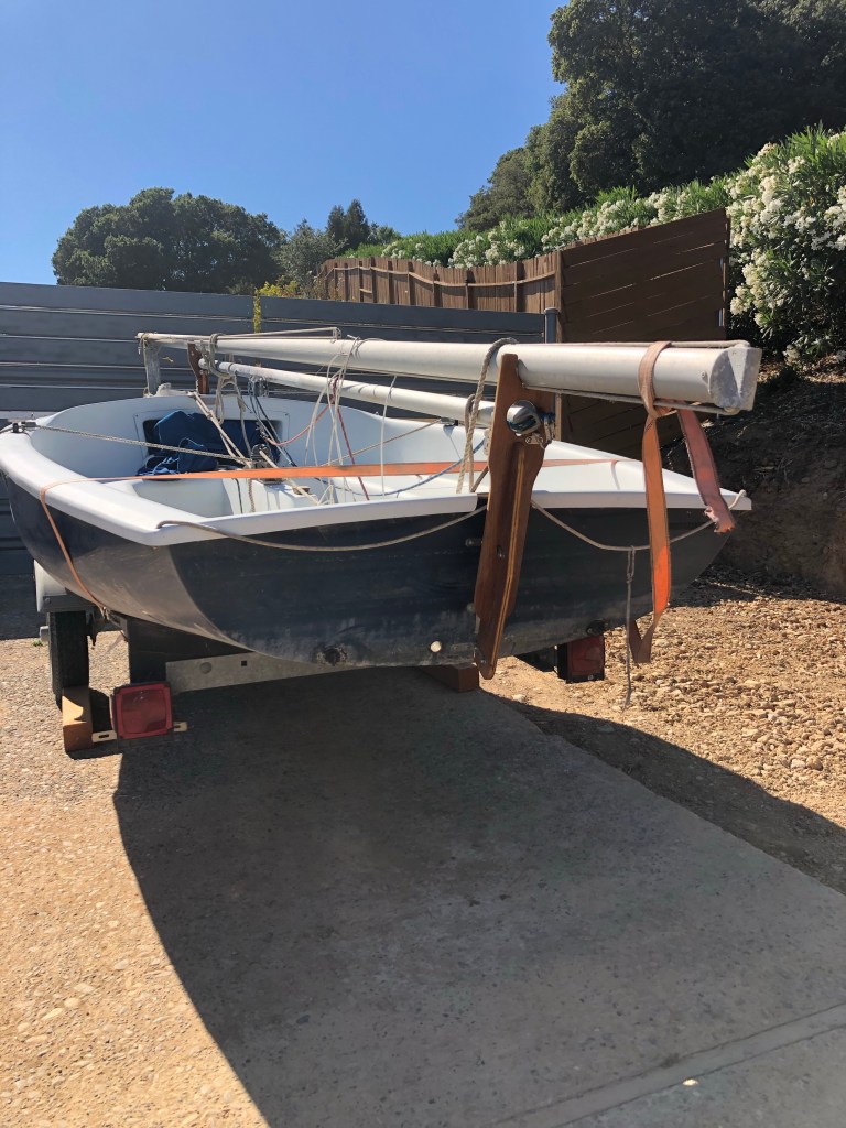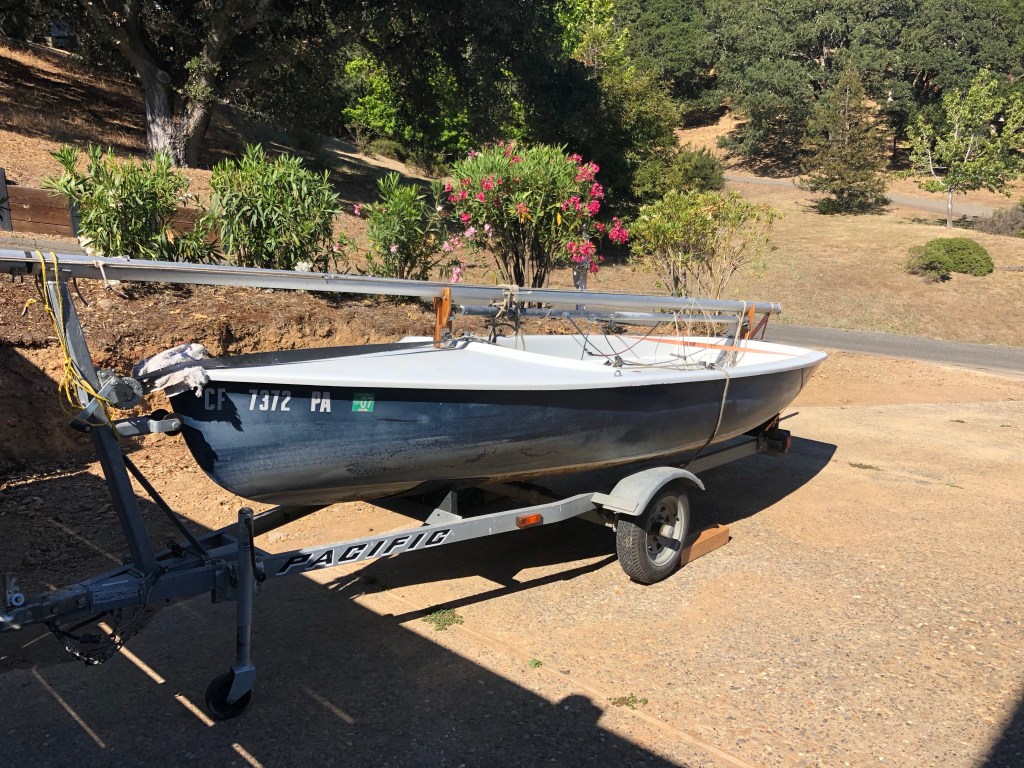 #3 is the Carters’ keeper. The 84yr old gentleman I met yesterday went to a boat show in 2006 and fell for a lovely little Lido 14. He bought it new, very well equipped, and placed it at his dock lakeside in suburban Sacramento. It joined the fleet (the two listed above) plus his Laser and his ElToro. And for some reason the Lido didn’t get sailed. The hull topsides are badly sunburned and the bottom is really dirty. The forestay wire unraveled. But with some elbow grease, I think we’ve found treasure!