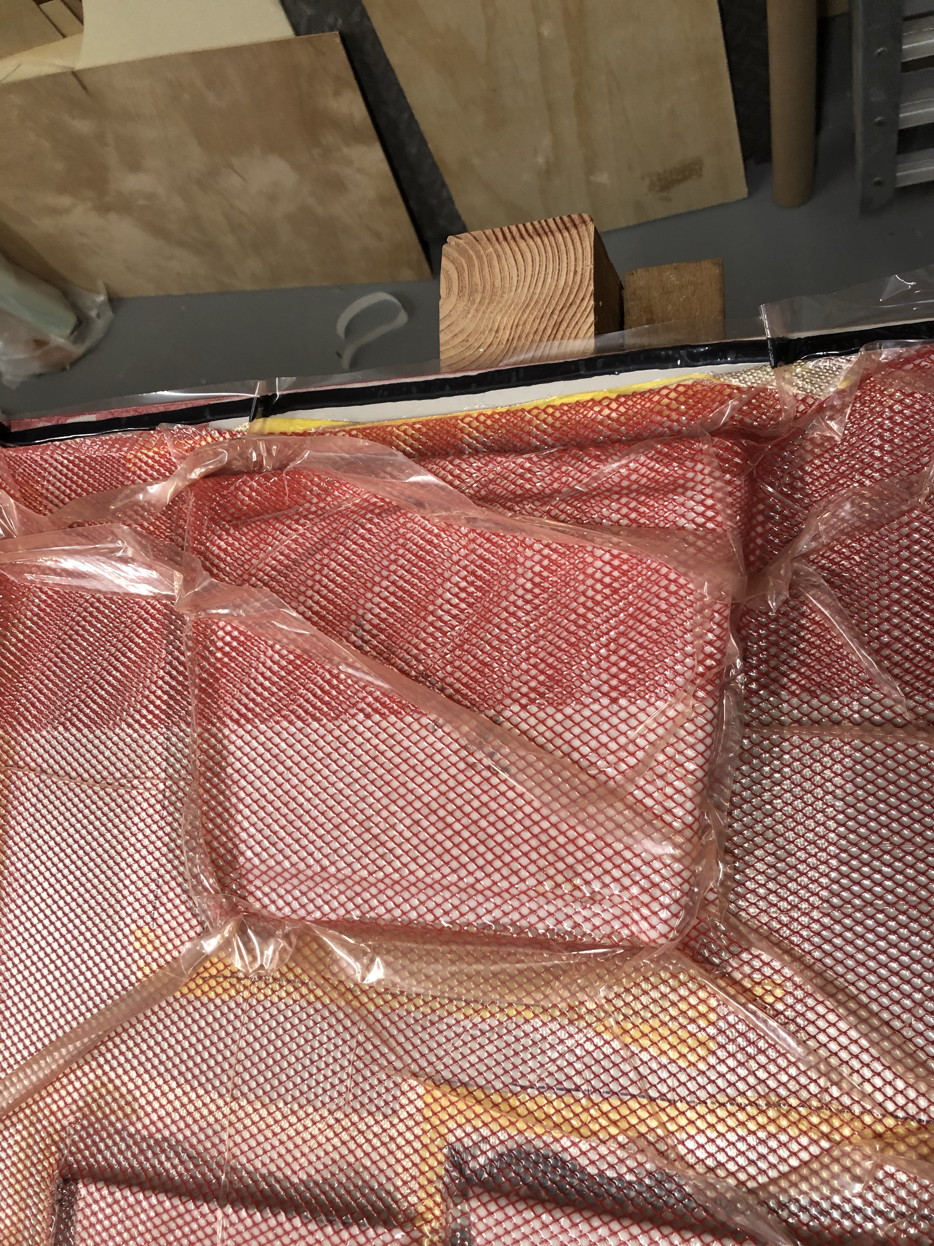 By 9:30pm we fired up the pump and got a nice -25bar suction bag. I really like this red plastic mesh spacer fabric. Learned about it two years ago in Mastachusettes during the mast build project. It allows for a very even bag suction pressure with only one air port in use.