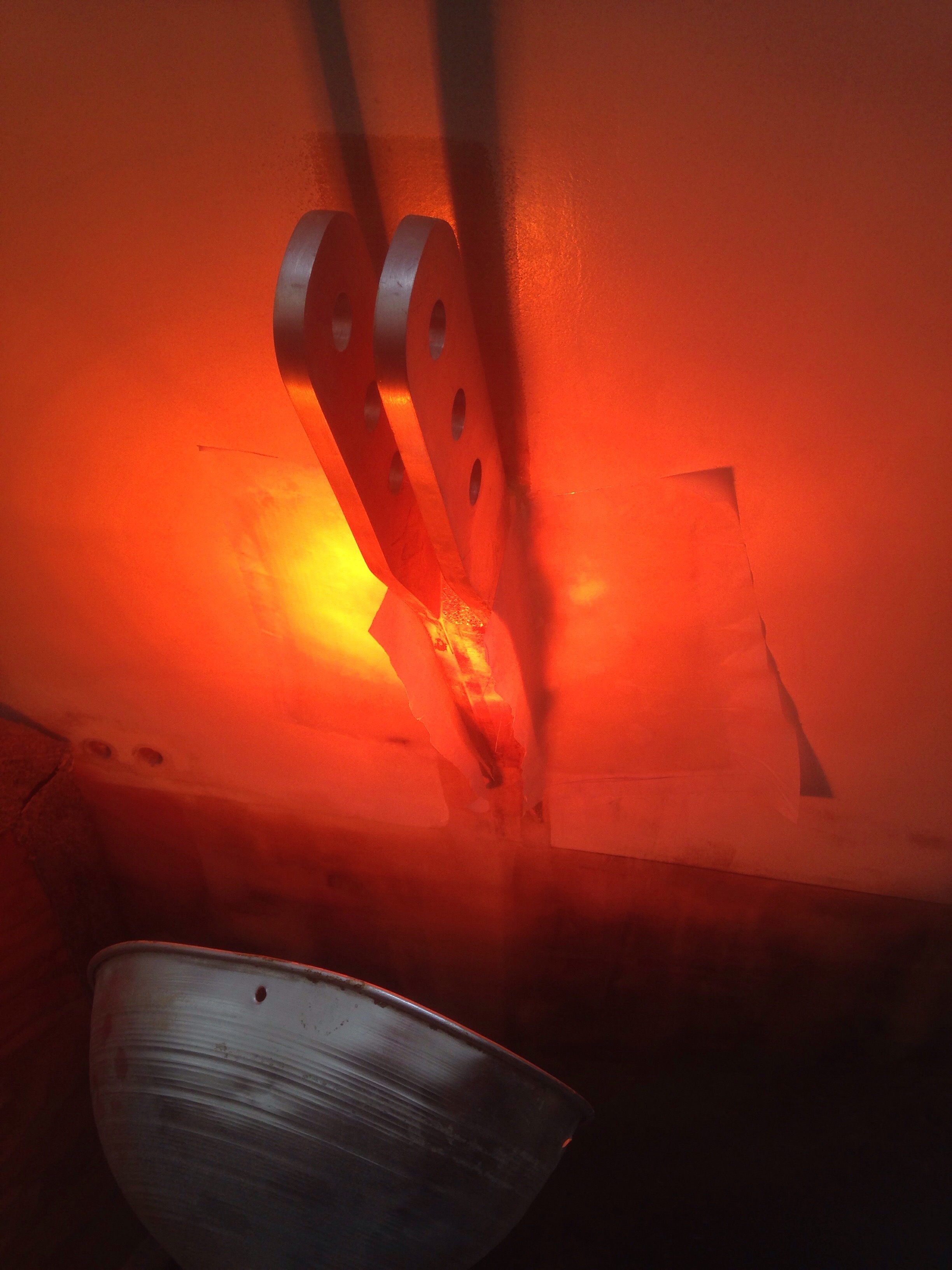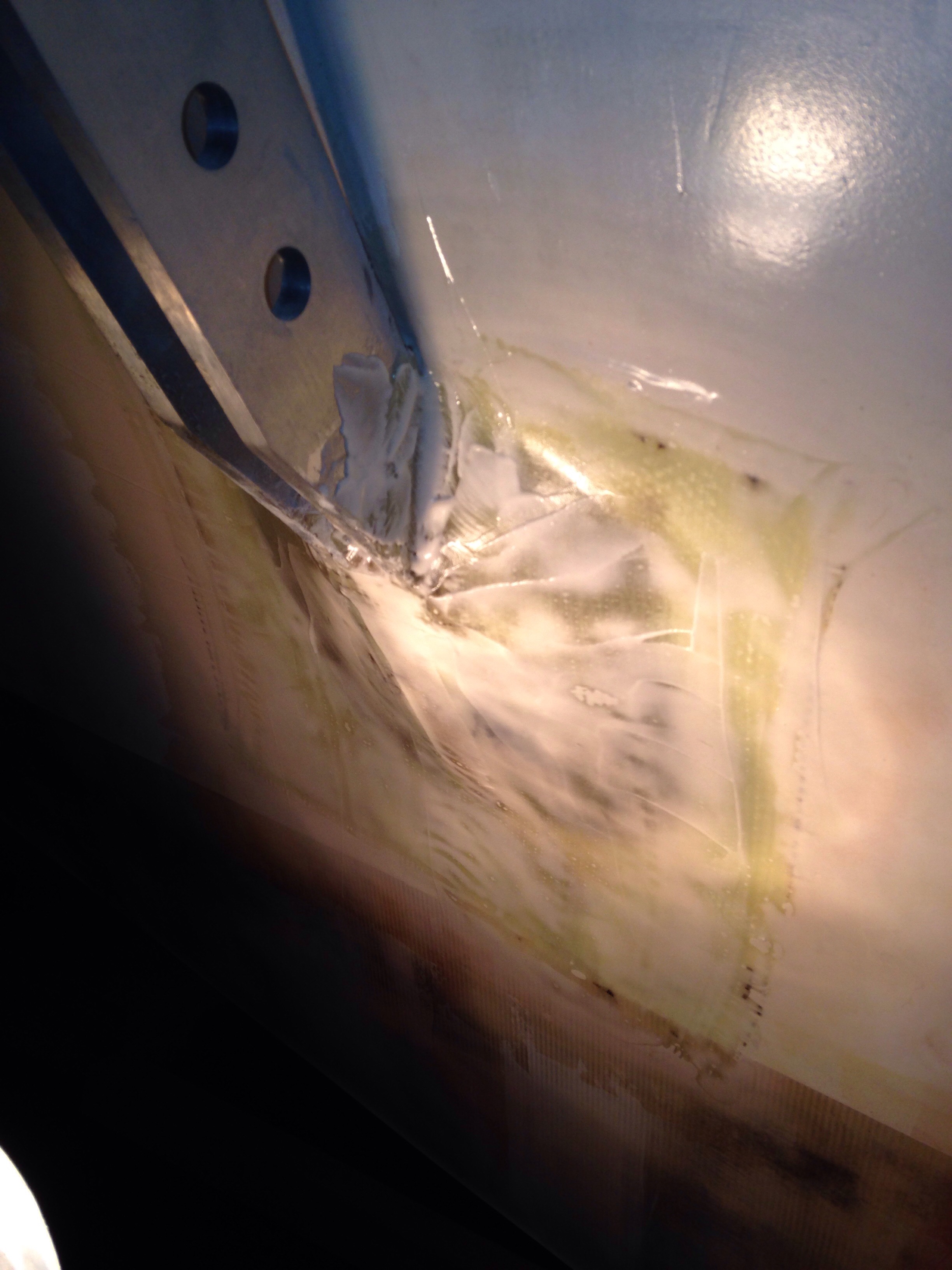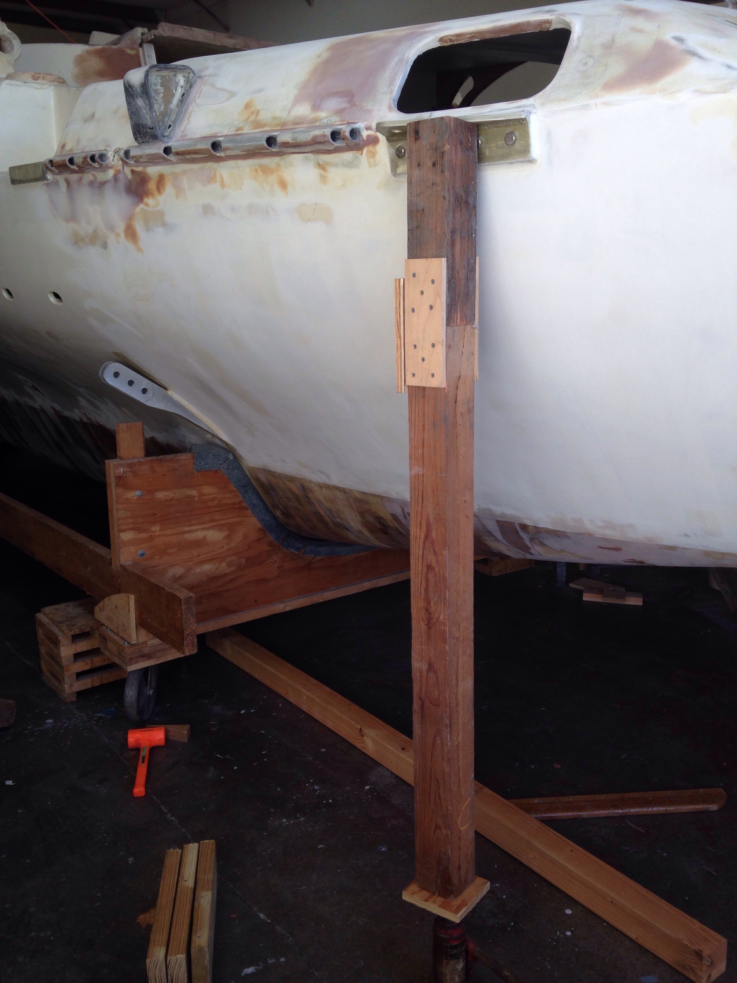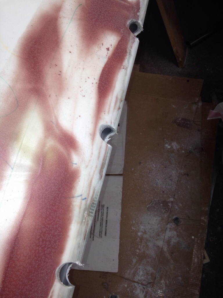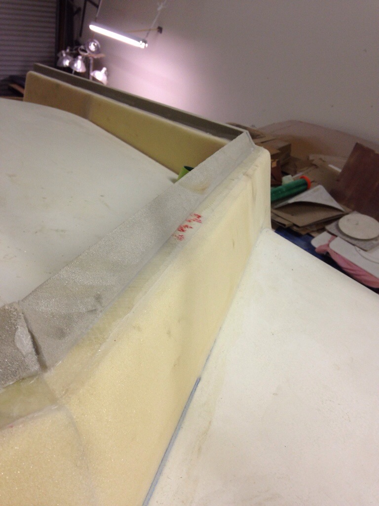 Just above the waterline we’re finishing up those beam brace tang fairings. The stack-and-glue foam was rough shaped with a wide blade on the multi tool.