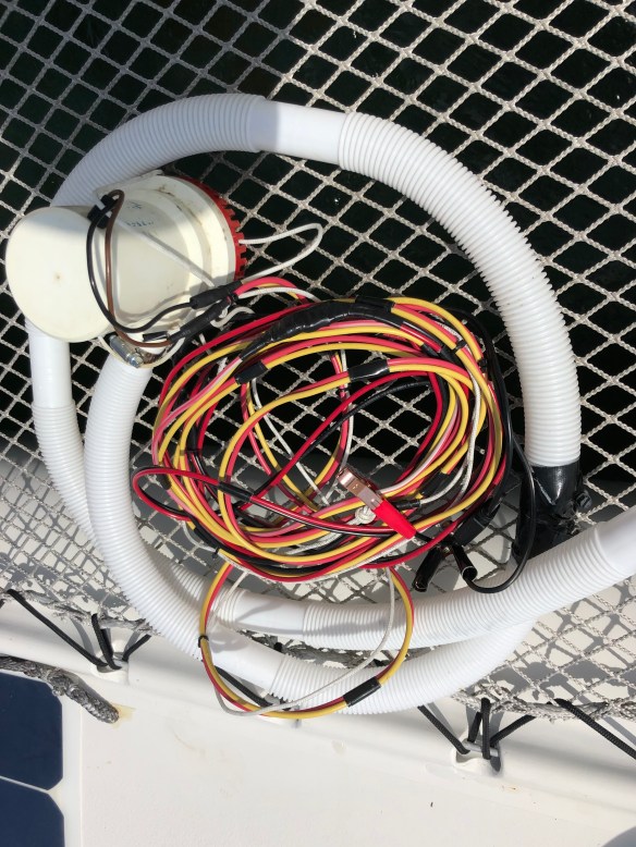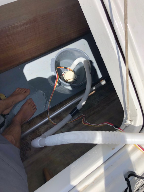 Yea, the boat builder didn’t think about how that big 2,000 gph in a little bucket would behave. Of course it flipped it over and pulled the hose back inside. So while the pump works great, operator error resulted in emptying the gear and drying out for the afternoon. Never a dull moment on Ravenswing.