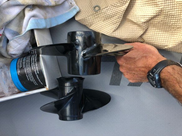 While buying parts I asked the Suzuki dealer about propellers and our inability to power above 4300 rpm. And we have very little reverse capability with the stock 9″ diameter, 10 pitch. Two years ago I went rogue and tried a flatter four blade but that didn’t solve it. Wish I had found these Suzuki guys in Sausalito sooner. Came away Wednesday with this.