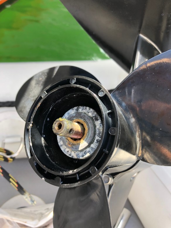 10″, 4 blade, 5″ pitch. Very different and hopefully a game changer. But of course, it didn’t fit right. Here’s the old prop, ready to get the washer and prop nut.