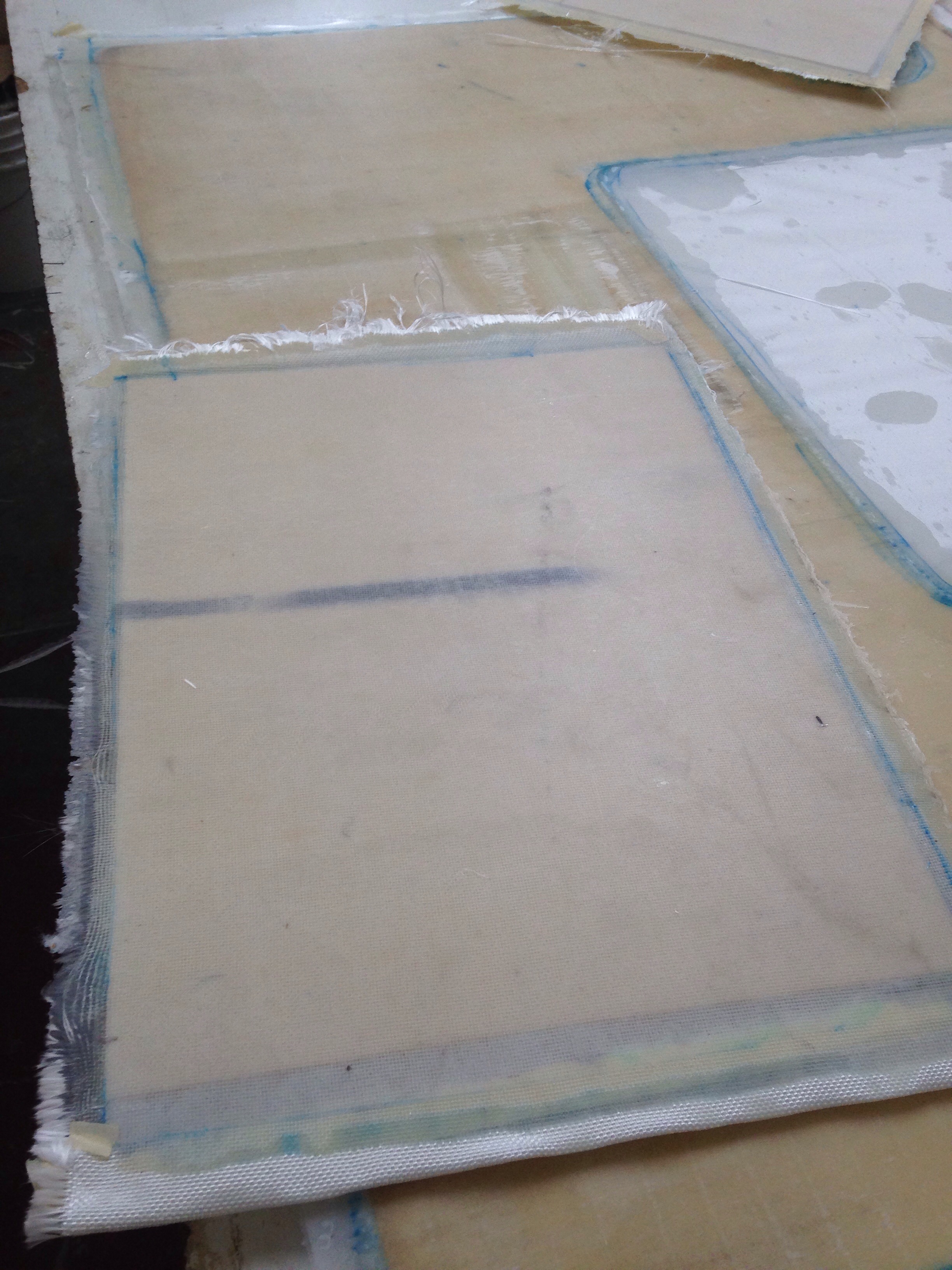 I noted in F39 Henny’s and F33 Arno’s blogs recently each spoke of it taking about three hours to get vacuum’d panels all set up and working. That’s my number too. This morning was about 3 1/4 hours getting all the fabrics cut, bagging supplies ready and prepping the after lunch lamination session. Last week we let a wetted sheet slip inside the bag for that float hatch and developed a wrinkle in the piece (that had to be ground away and patched). Got me thinking that we really shouldn’t move a piece at all during the wet out process. So today we tried marking the first-to-table peel ply with the exact foam core locations then taping the peel ply taught at the corners. This worked well.