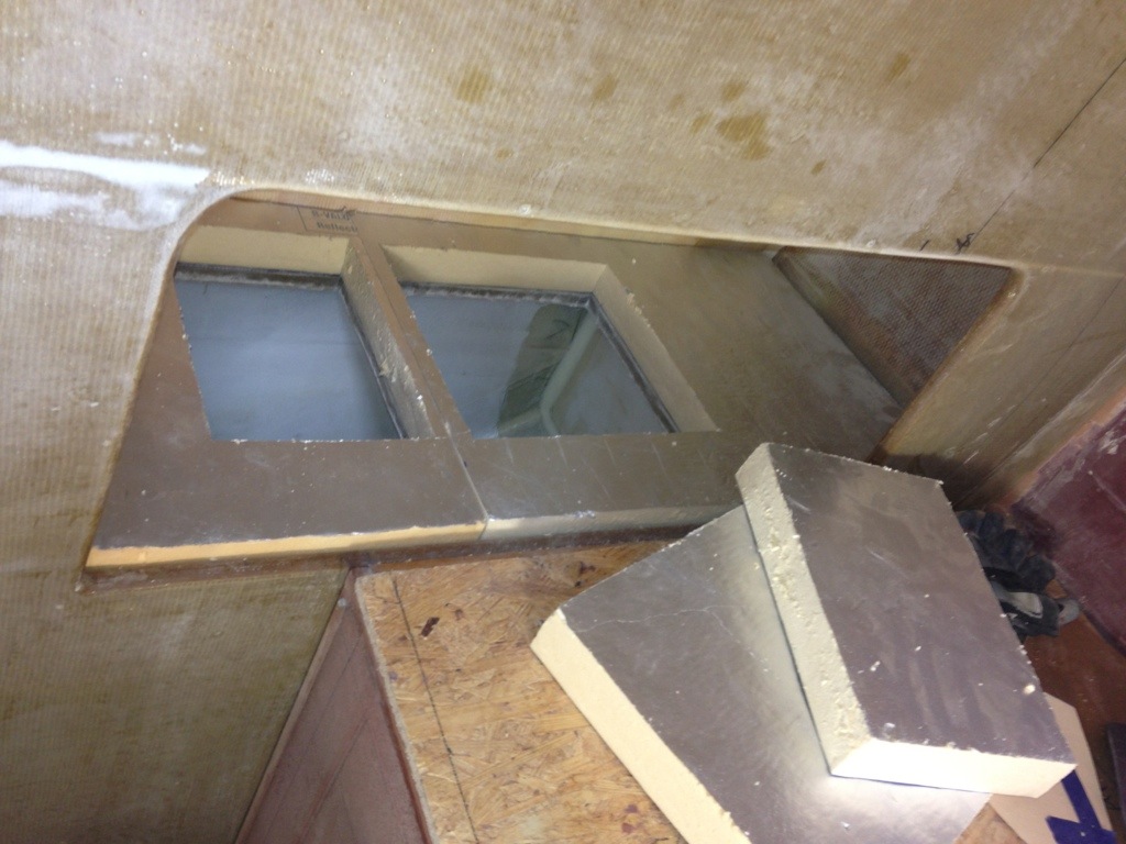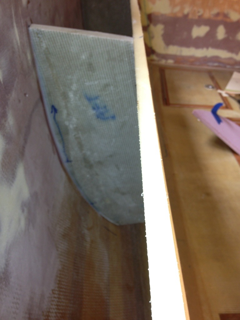 The head compartment cabinets are all faired in, ready for paint. Need to make a couple of doors, and the L shaped part in the right of the photo is a removable section for easy access to the toilet plumbing.