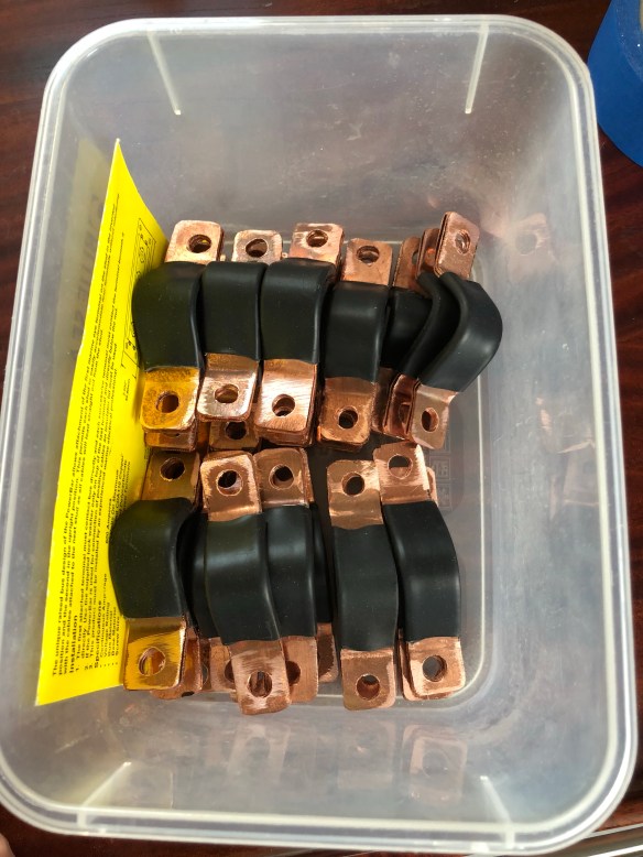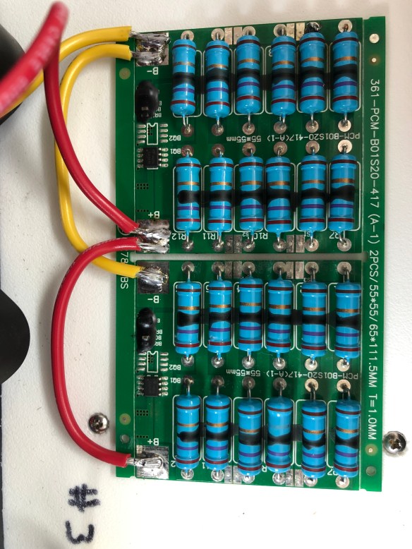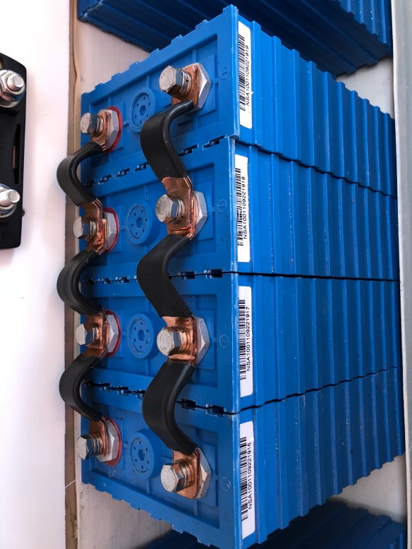 what you’re looking at (the green circuit boards mounted above the batteries) are charge balancing modules to regulate the pace at which the four “cells” of this battery bank rise in charge voltage. The risk in an LiFePO4 bank is the cells getting out of voltage balance from their neighbors, and potentially ruining sections with out-of-range values. With these little control boards, when one cell reaches 3.6volts (its full charge), the incoming voltage is converted to heat in those blue resistors. That cell is effectively bypassed from further charging while the others catch up. That’s as simple as I can say it, but there’s more going on with the numbers. It’s a crude version of a Battery Management System, and we’re judging it sufficient for our solar-only gentle charging regimen. Coming up soon we’ll install the CellLog that monitors and alarms each of the four cell voltages that get out of range. That will complete our safety installation.