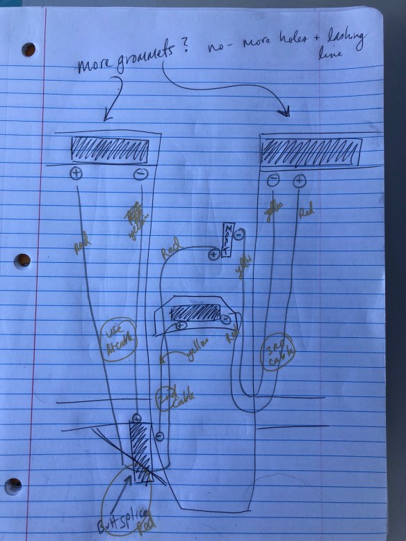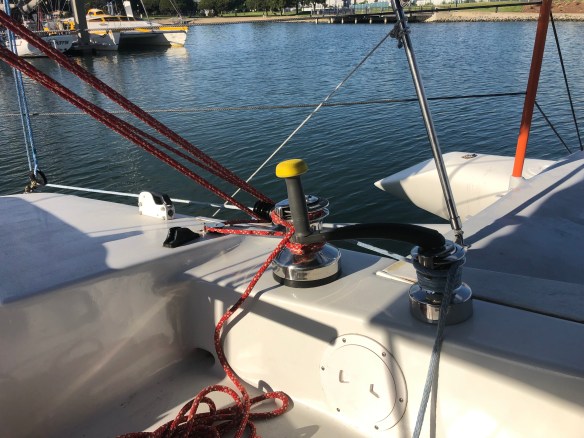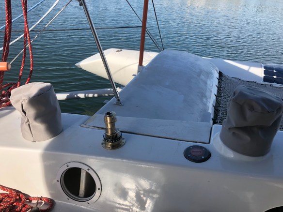 That work session also included marking the entire 340′ anchor rode in 20′ increments with bright yellow spray paint, and setting up the anchor bridle semi-permanently for easy, frequent deployment. Quite happy with all that now.