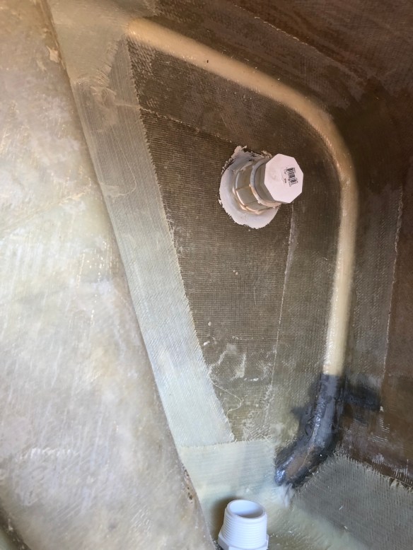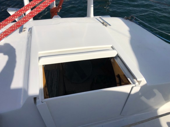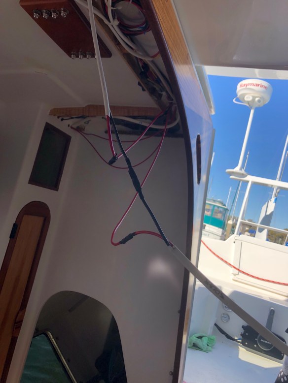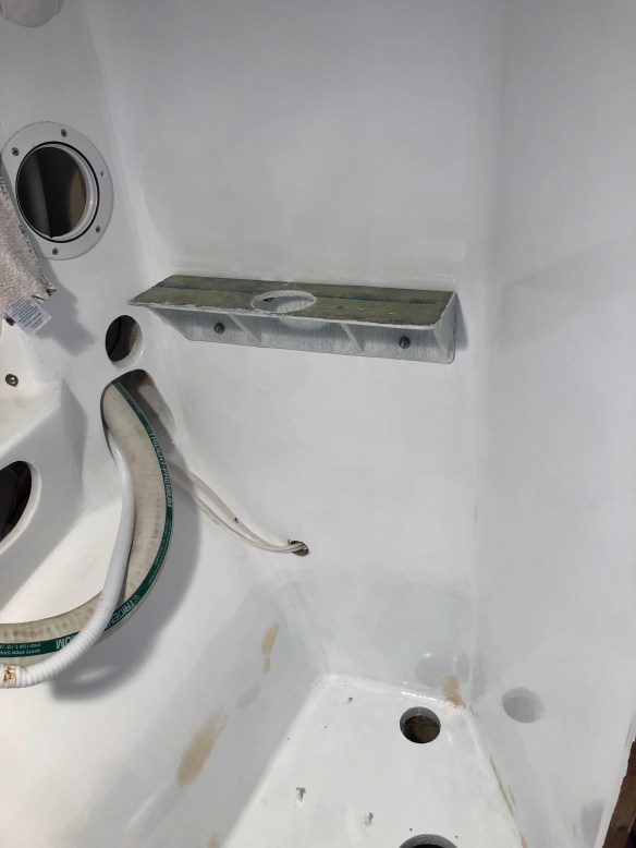 Also in that photo note the solar shower heating up. Thank you Drew for the tip on a better, bigger one. Hung from the boom and with an extended supply line, this provides an excellent hot water flow thru the ventilation hatch overhead of our shower stall. I actually had to wait until the evening to use it because it got warm. Around 105F, like almost too hot to bear hot tub. This will do just fine until the boat goes to cold weather places.