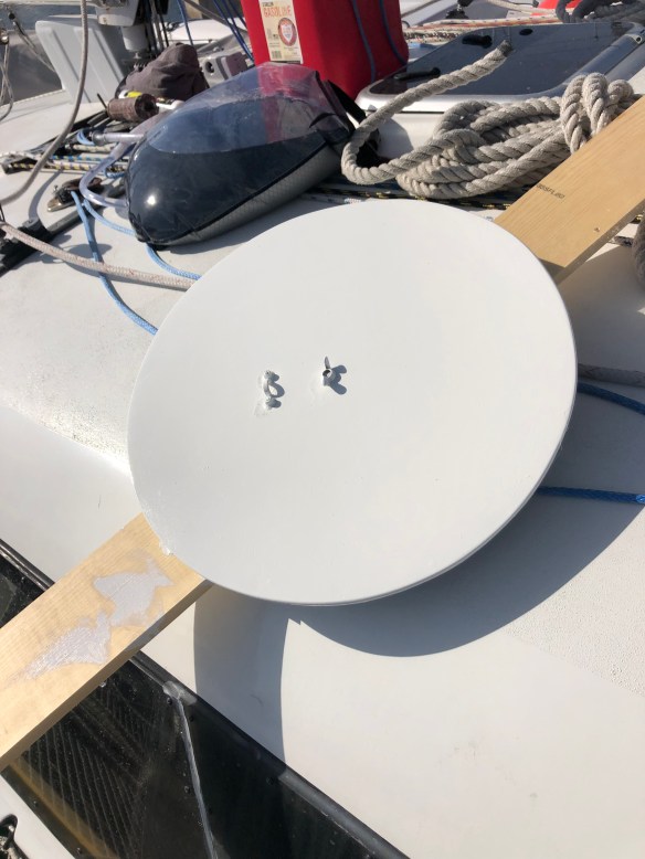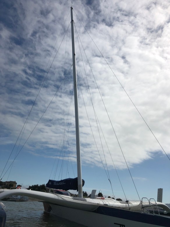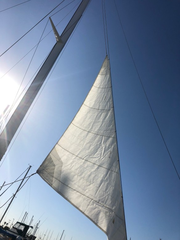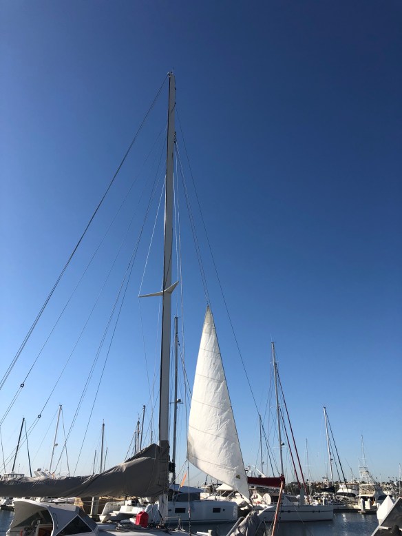 In retrospect, I’ve realized there’s more overlap of the mast with this sail than I had wanted, and we have to solve for the diamond wire interference. Hopefully we’ll be able to solve this with local support, rather than the jib having to travel cross country again. Stay tuned.