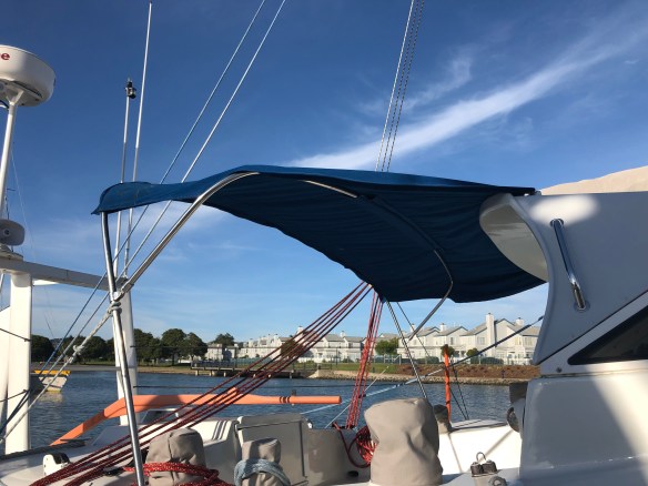 An earlier sewing job had been a cover for the Bimini. That fit fine and looks much better than the beach towel we used on the Cal coast sail.