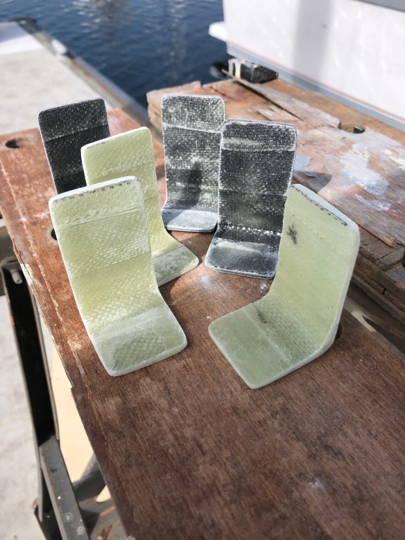 It was supposed to be sexy exposed carbon weave, but the square tube shape was tricky to mold and there were various little wrinkles and gaps, so they needed fairing then paint like everything else. This all got started last June visiting Skateaway when Keith impressed on me the problems with leaving heavily loaded halyards in the teeth of rope clutches during ocean passages. So now the sails will be raised and trimmed with the help of the clutches, but once underway the lines get cleated on these new pins then the clutches eased off.