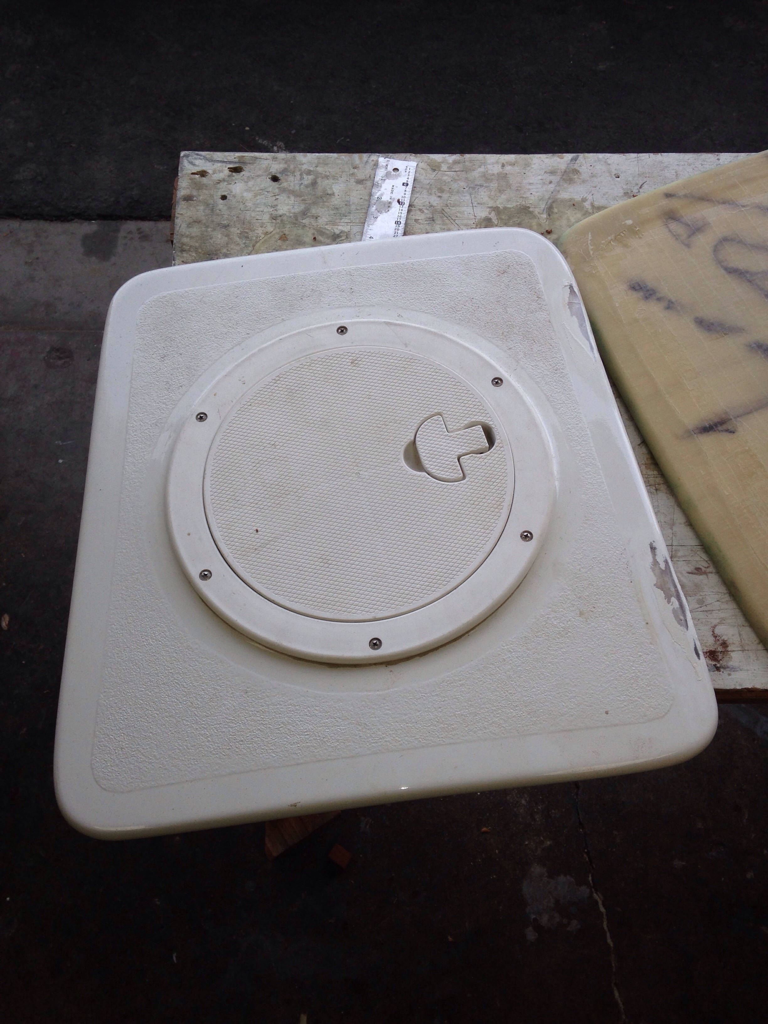 See how nice and centered that floating port is in the fixed pane? Well that of course didn’t fit on the boat! Thought it was so clever to work it out on the bench, but never held it up to check before cutting. Damn, it was supposed to be 1″ off center! The metal frame hit the hull so I went home Friday night deflated. Saturday noon trip to TapPlastics for $130 more Lexan and by dinner time we had two replacement panes cut, edge-radiused and drilled. Installation took from 8pm to 12:30am, and now we’re happy.