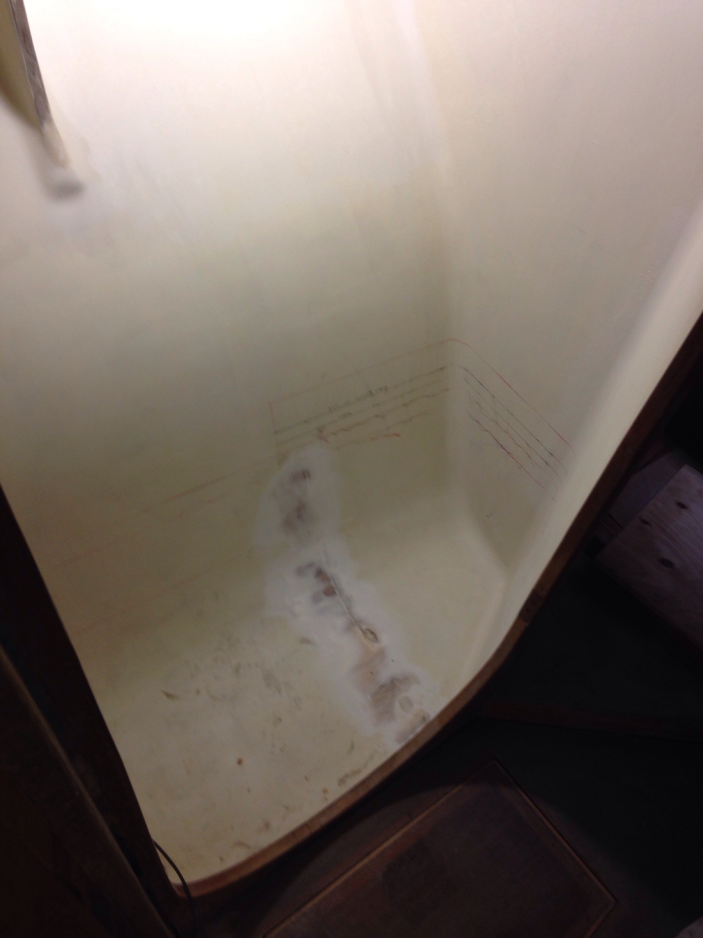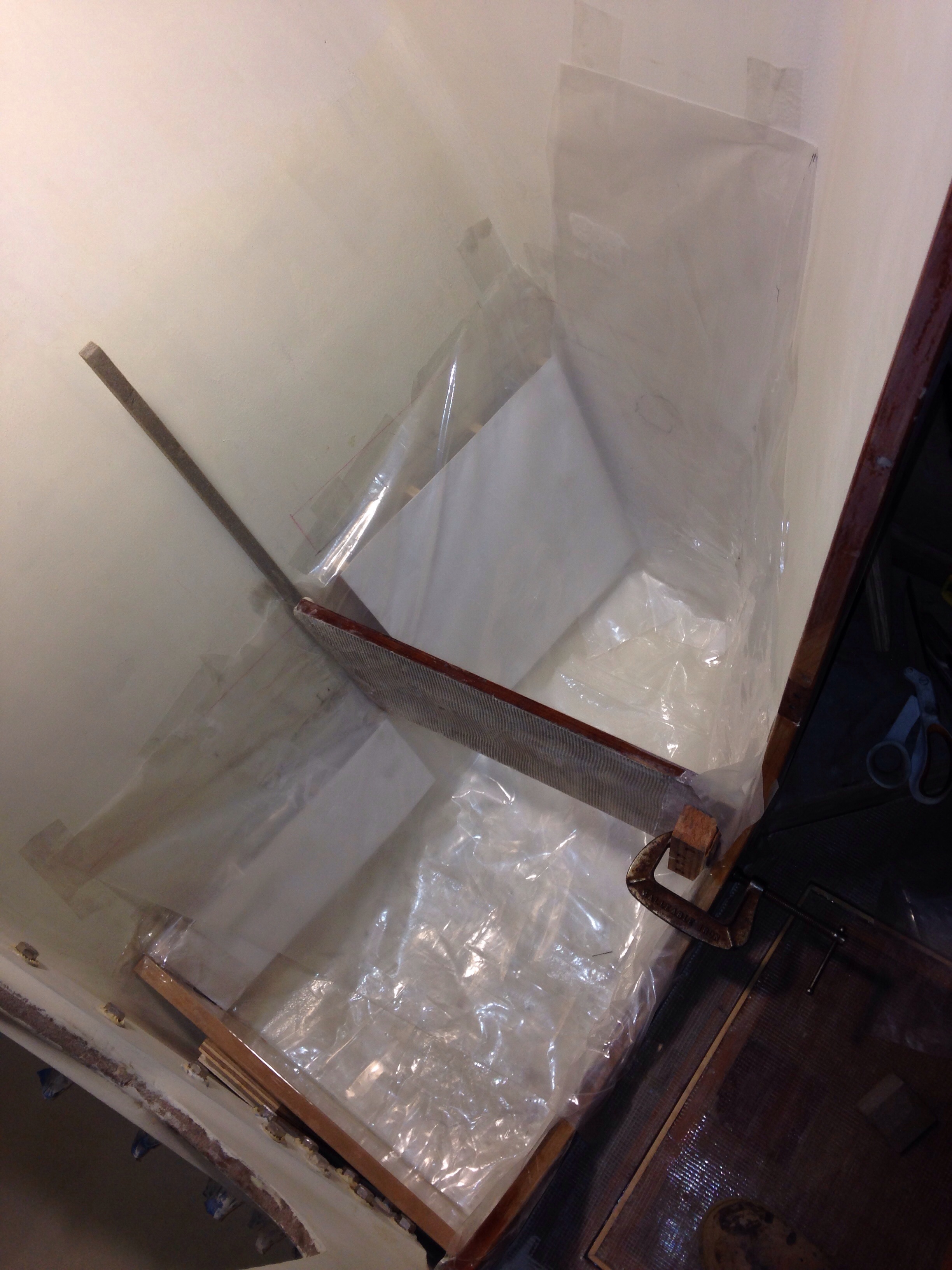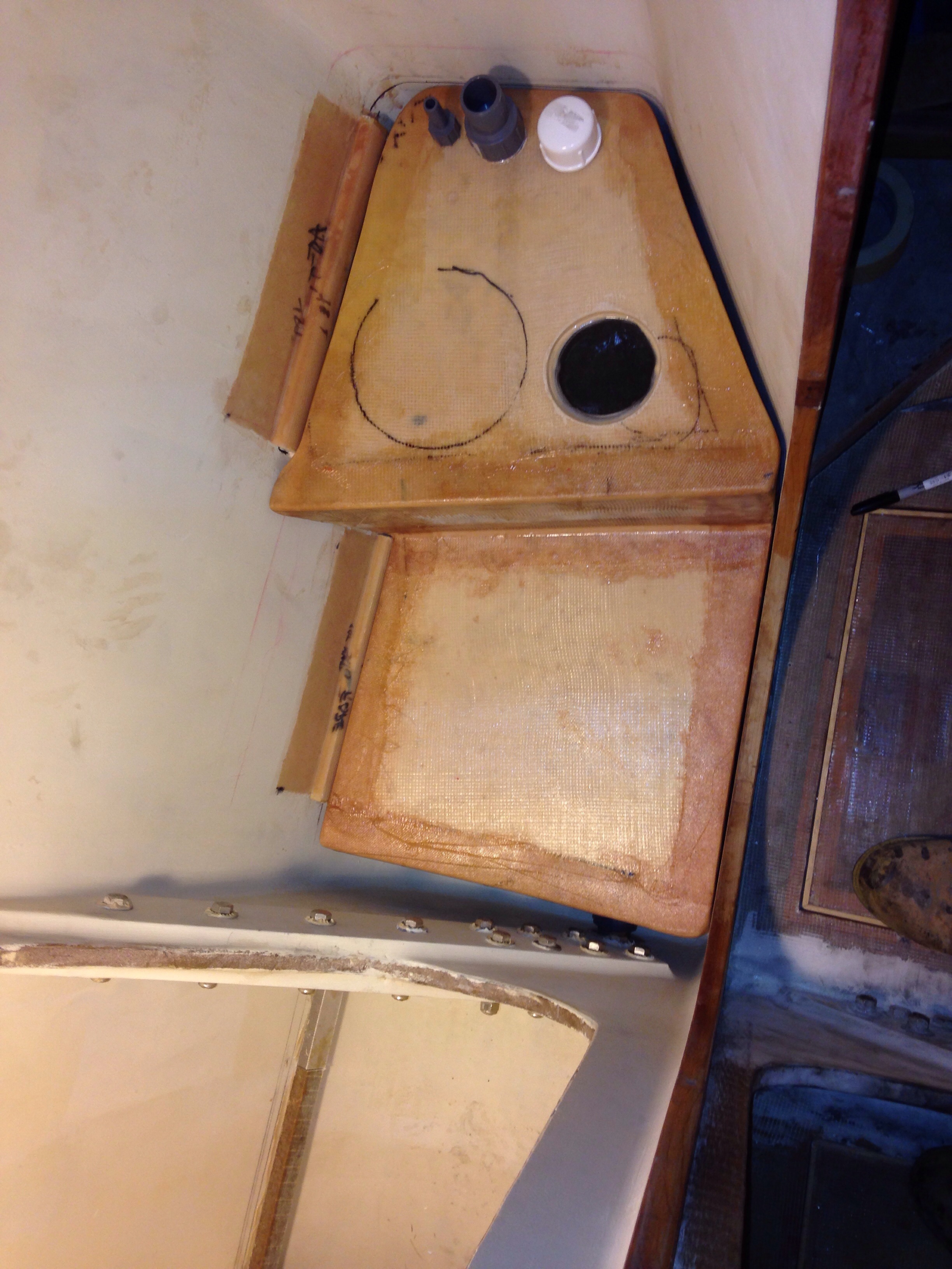 The main cabin is getting final furniture building. Here’s a cardboard mockup of a backrest cabinet for the seating position on the starboard day bunk. The base isn’t very wide and the hull curves in steeply, so it’s a tough balance to preserve lying down comfort yet make the backrest functional for sitting up. It doesn’t extend to the bulkhead in the left of the photo because that’s the most comfortable spot, leaning back on that locker wall with your feet up on the bunk. Thanks Charlie for the idea to make the backrest swing up to reveal a small storage cabinet.