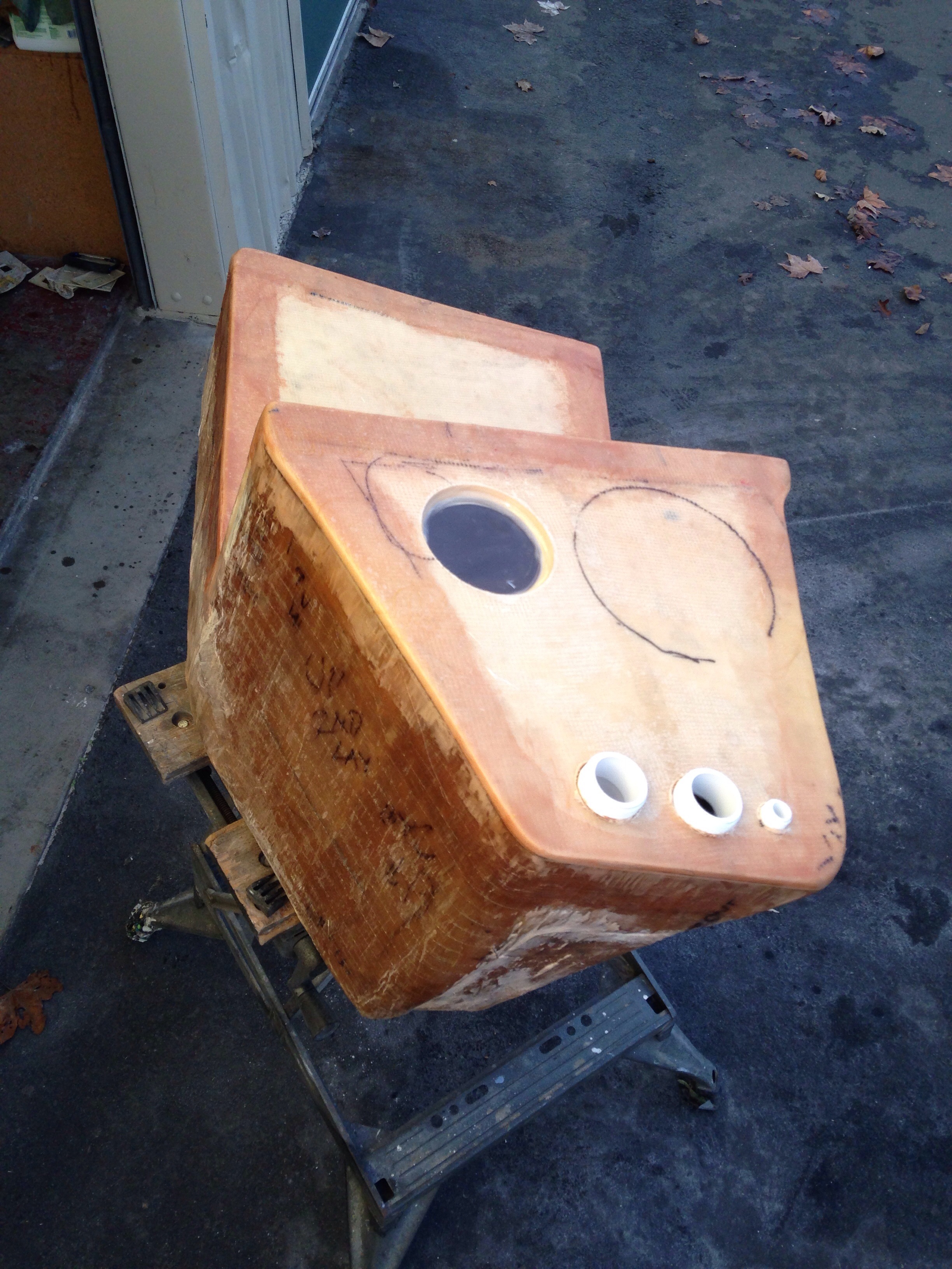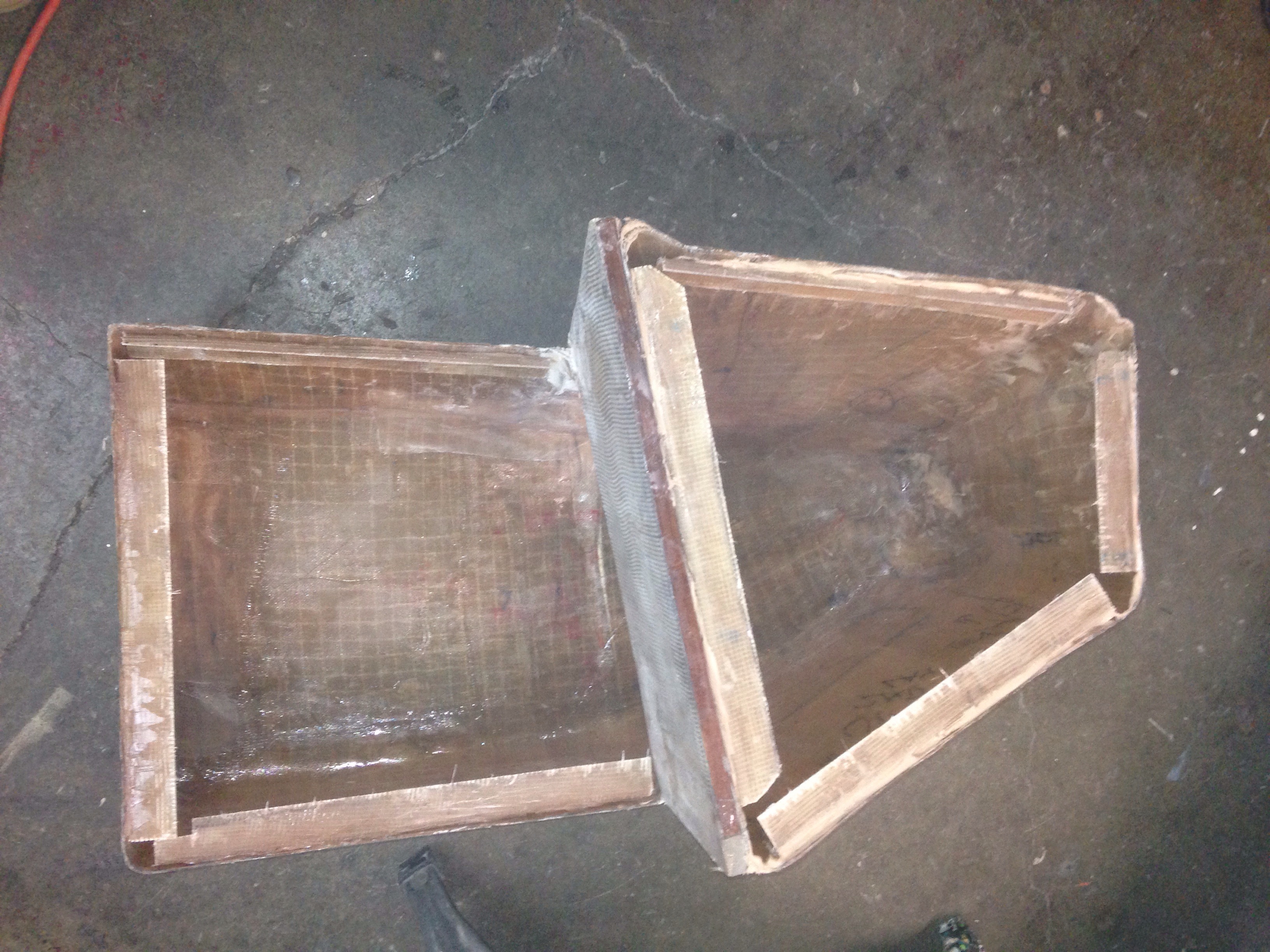The wood wedge was then clad in two layers of 12oz BD fabric. This piece was vacuum’d in an actual bag, not on the flat table. The bag pressing in on all sides if done right will put the excess glass right in the middle of each edge for an easy trimming job. This one went pretty well.
