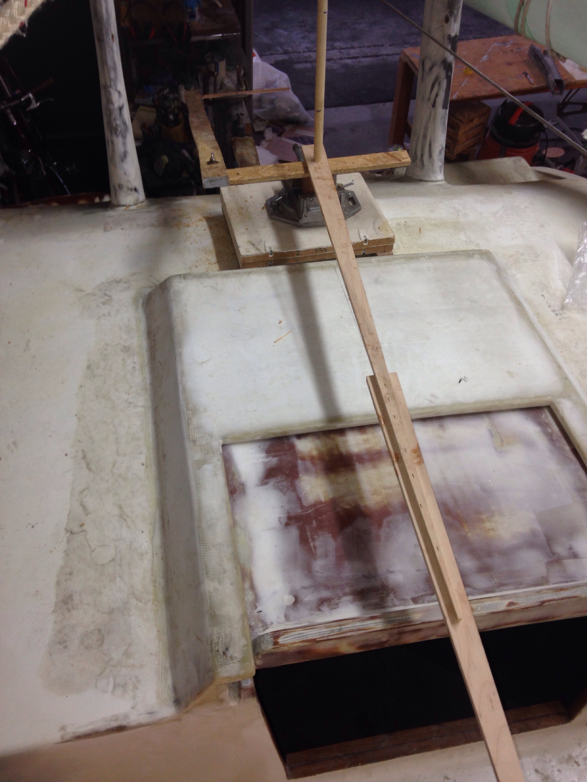 We talked today about adding a piece of steel atop the wood wedge with the mast base you see above welded to the new plate. That way the bolts holding the whole thing to the deck would pass through steel. As it stands now, the steel square has to be bolted to the wood wedge and the wedge then bolted to the deck. The steel square isn’t wide enough to span the dagger slot and be bolted directly to the deck. Anyone have experience or engineering perspective on this?
