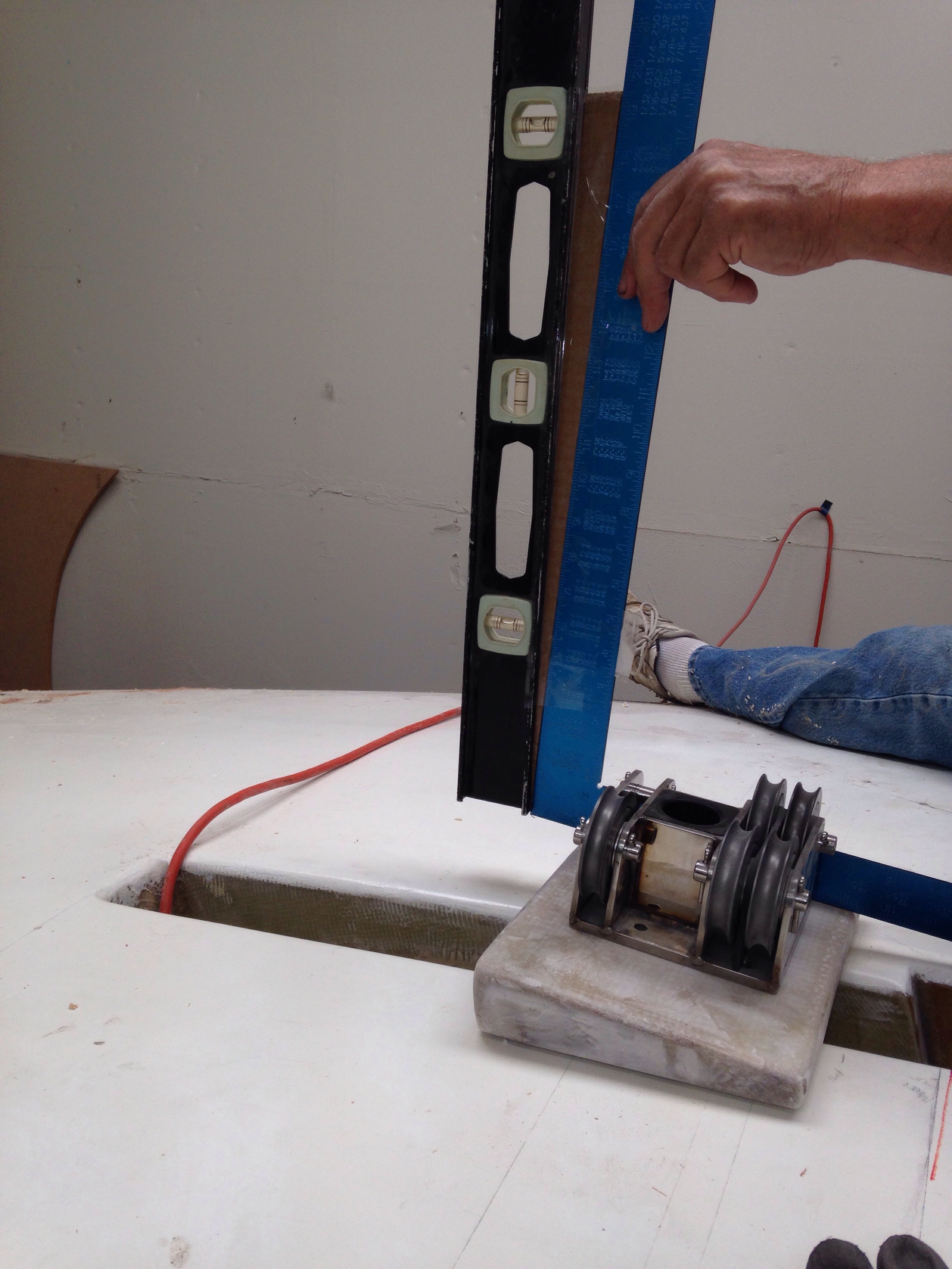 Not talking about Kevin Bacon here, but rather the need to rake the mast back three degrees from vertical. This tilt of the mast helps the sailing responsiveness and has been factored in to the exact mainsail shape (which is under construction in Maine right now). So we need to get this right.