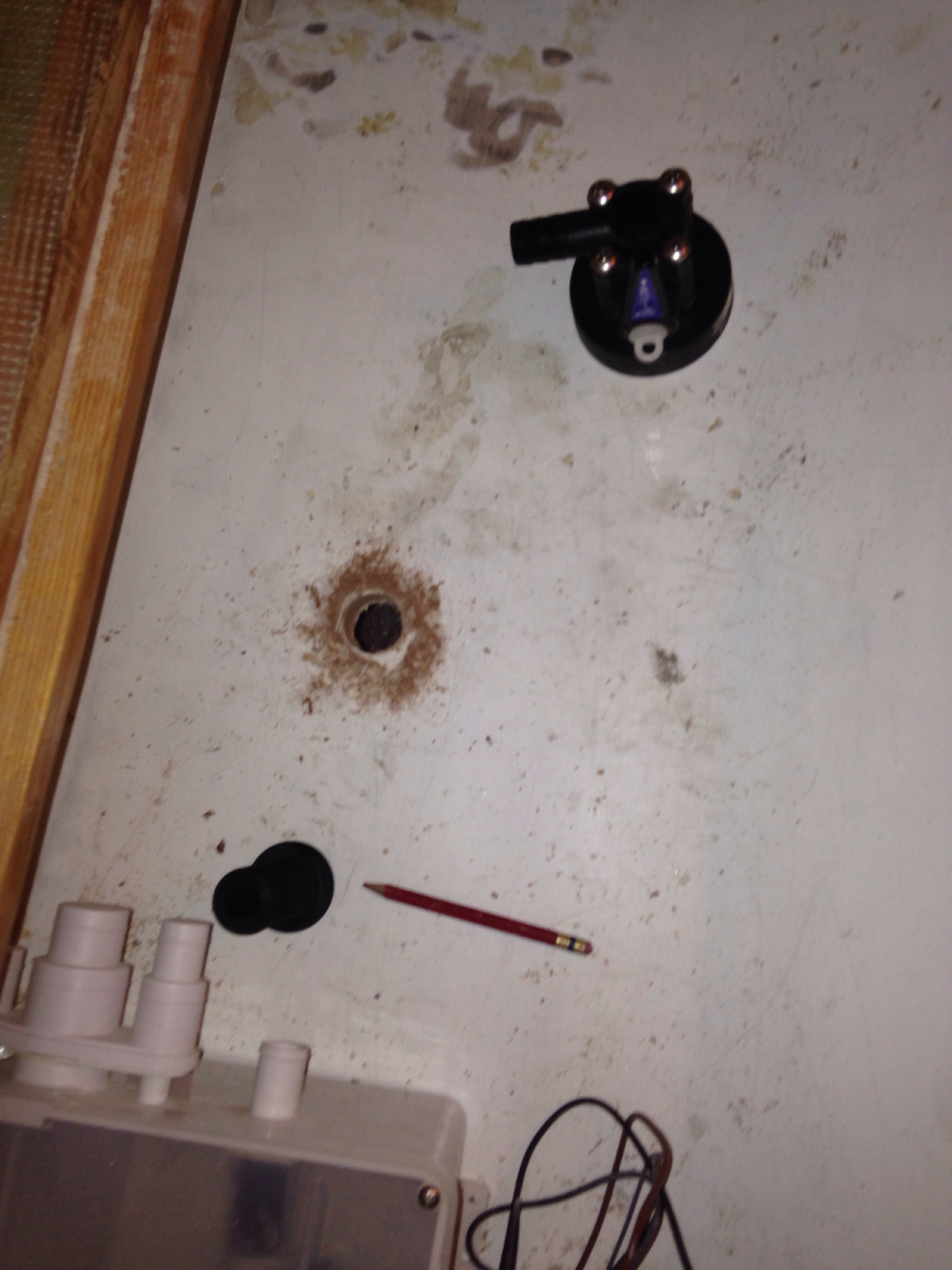 After giving Defender the Amex number, we tackled the first through hulls. We’ve made plumbing decisions such that there’s only one below-the-waterline plumbing hole (for a seawater manifold) and one for the depth sounder / speed sensor. They are going in tandem placement, just starboard of the daggerboard.