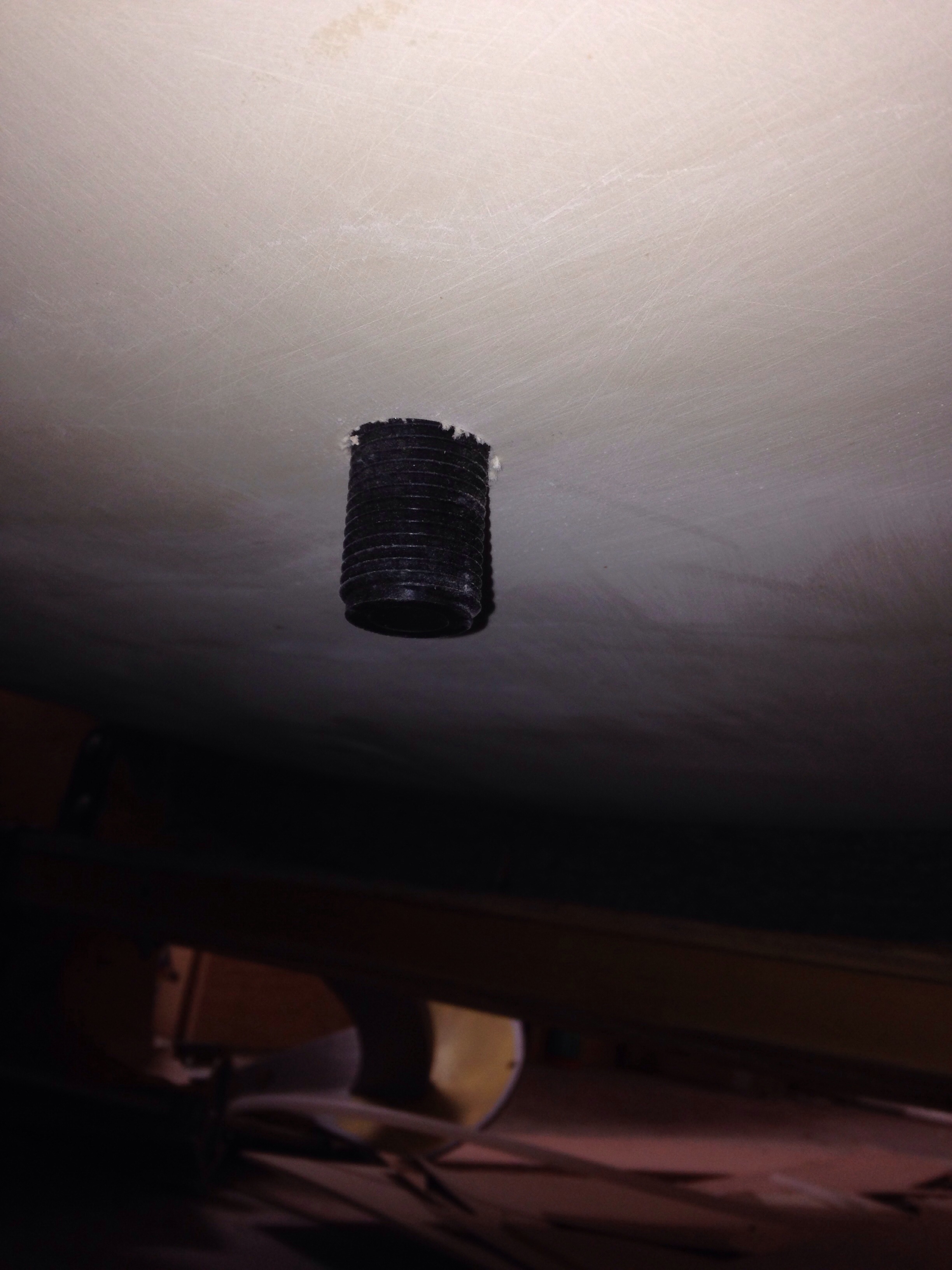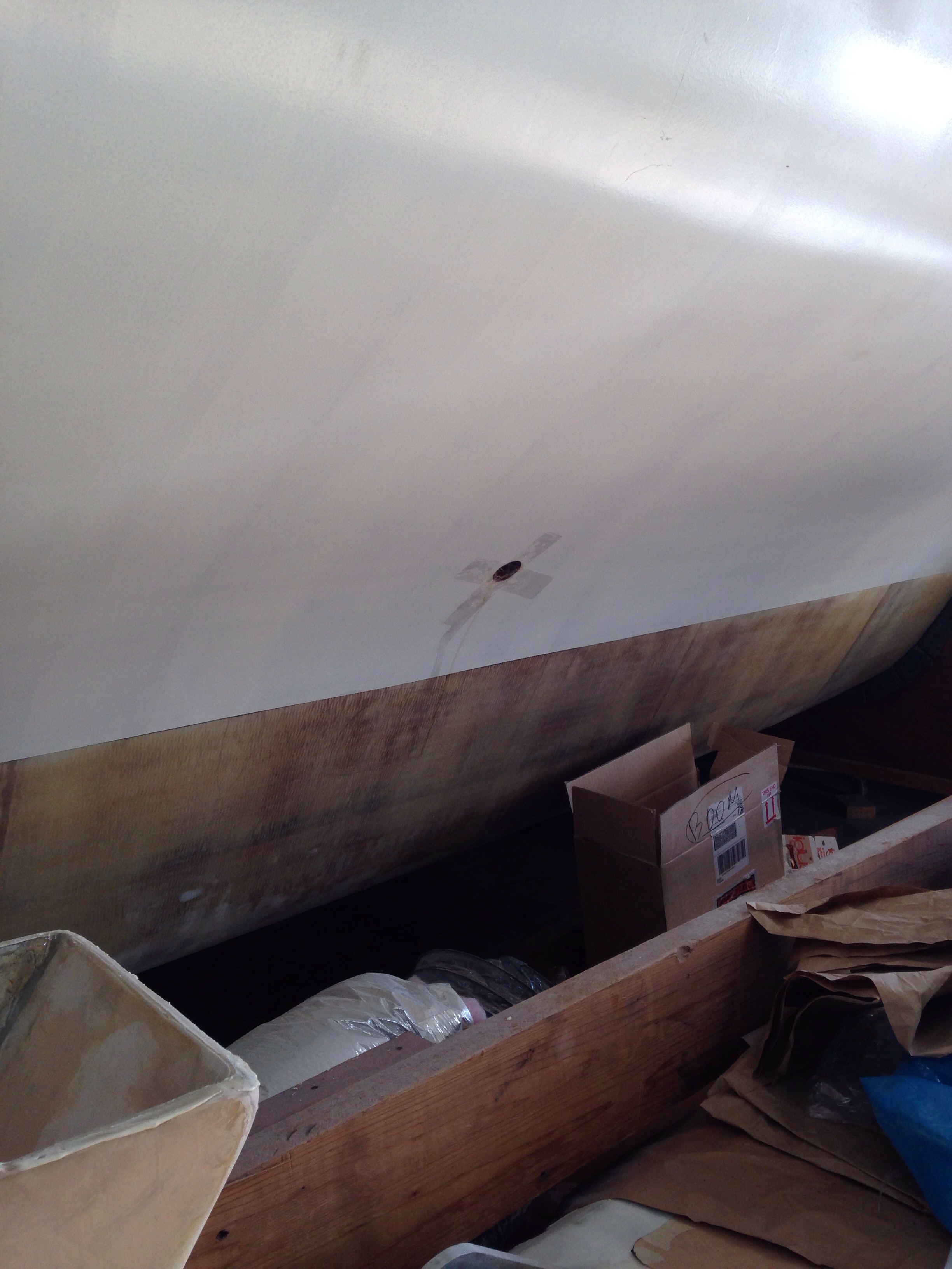 Here’s the thruhull inserted upside down to check the depth; we needed to cut off about a half inch of threads. In the second photo you can also see the Kevlar outer skin in the ‘shadow’ of fairing compound – that’s about two feet wide from the bow back towards the stern.