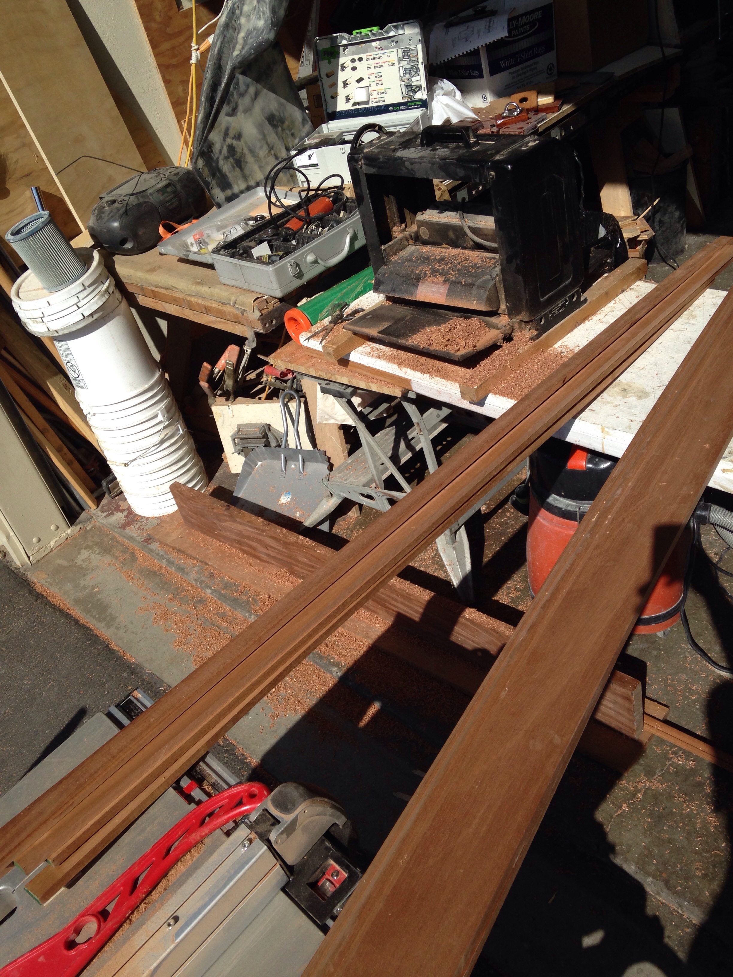 And we’re spreading mahogany dust all over the driveway as the portable mill rips and planes repurposed baseboards and casings in to lovely boat interior trim. The boards on the right end up as excess stock when cabinetry clients change their minds. Good neighbors to have during this build!