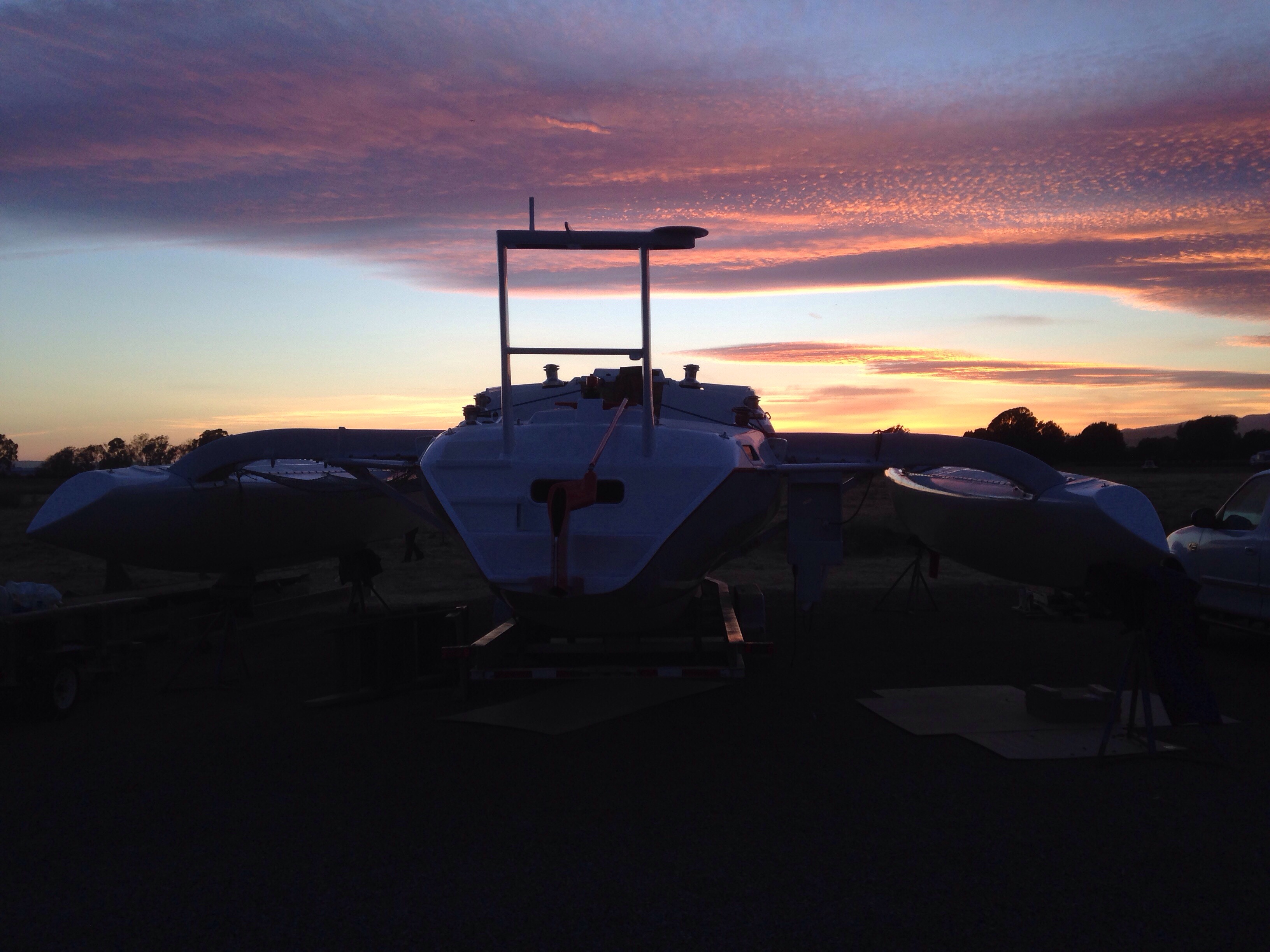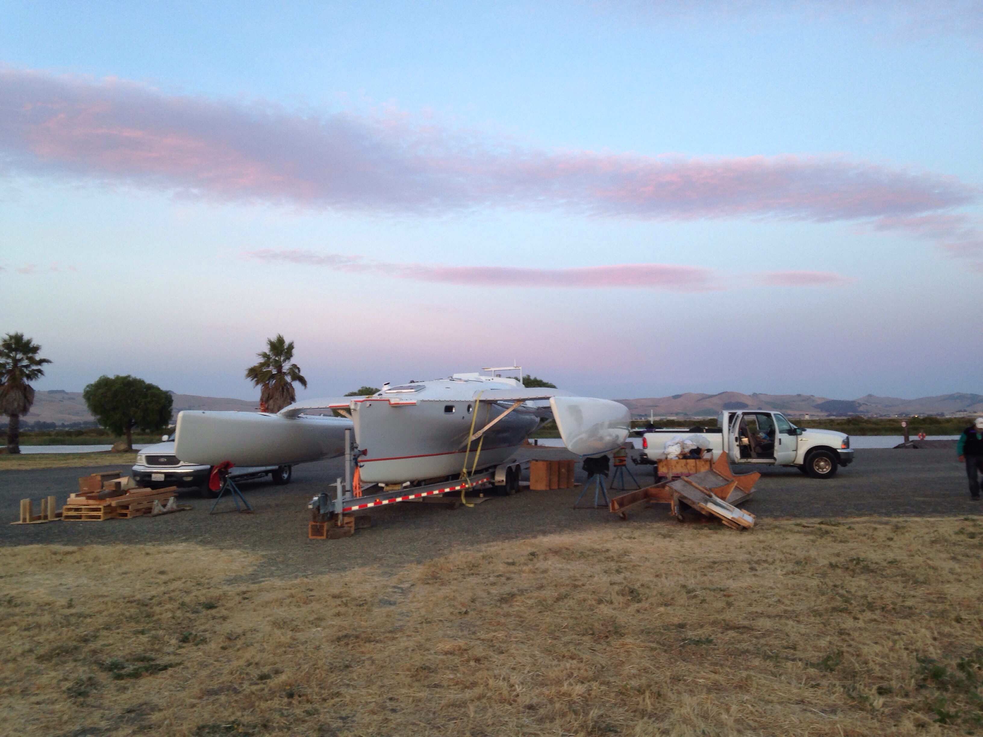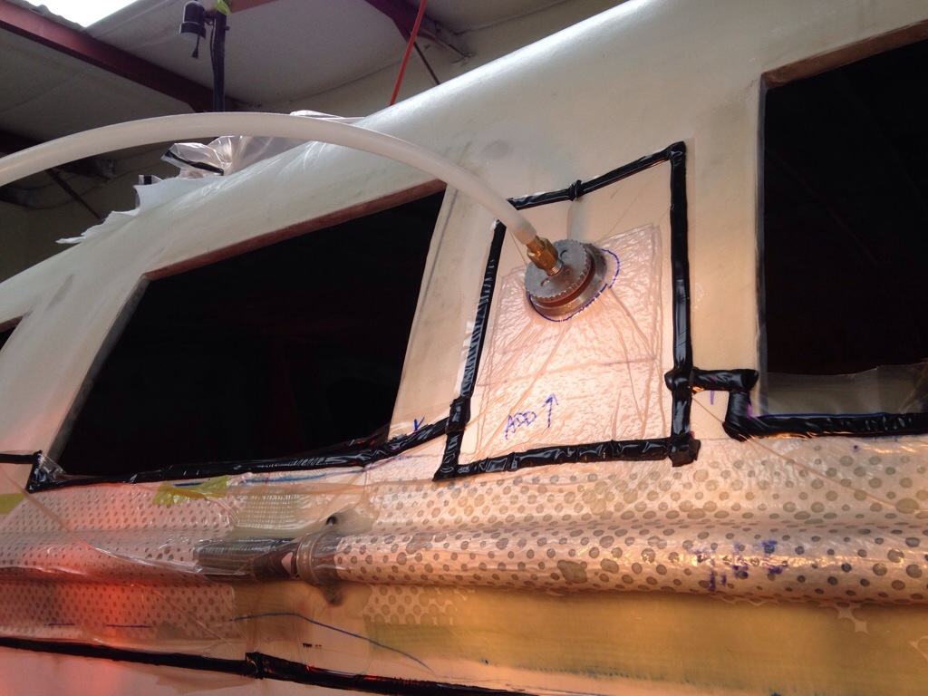 That’s the second of four stages vacuum laminating the net lashing tubes to the hull’s port side. Significant only because it’s the first success using a splitter to draw vacuum on two separate projects in one pump run. A small moral victory around here.